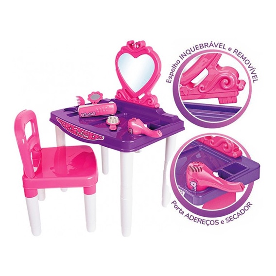 Master Penteadeira Fashion Poliplac® A Master Pendeadeira Fashion foi criada para a criança aprender as noções dos cuidados pessoais. Sentar na cadeirinha, se olhar no espelho e utilizar o kit de pentes e escova para deixar os seus cabelos arrumados e não poderia faltar um secadorzinho e a mini-chapinha para fazer igual gente grande. Noções de cuidados nos primeiros anos de vida que ficam para sempre! O espelho não é feito de vidro, mas reflete de verdade. Desenvolve a coordenação motora Introduz noções de cuidado e beleza de forma saudável Desenvolve a interação com o meio Ideal para brincadeiras individuais ou em grupo Desperta a criança para a convivência social O que vem na caixa: 1 Master Penteadeira 1 Espelho da Penteadeira 1 Cadeirinha 1 Pentezinho 1 Espelhinho 1 Escovinha 1 Mini-secador 1 Mini-chapinha