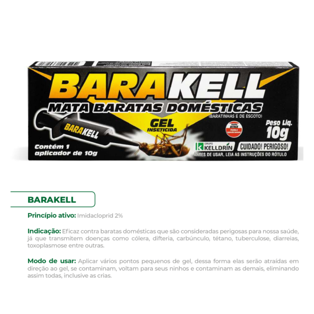 As baratas são consideradas pragas urbanas e podem representar riscos à saúde humana de várias maneiras, podendo causar alergias, ataques de asma, infecções e problemas dermatológicos, além de atrair predadores como aranhas e escorpiões, que também são perigosos à saúde. Para combater esses problemas, a Kelldrin desenvolveu um inseticida em gel, eficaz na aplicação rápida e eficiente. Indicação: Gel inseticida para o combate a baratas alemãs – baratinhas (Blatella germânica) e também elimina a barata de esgoto ou voadeira (Periplaneta americana). Modo de usar: Aplicar vários pontos pequenos de gel – do tamanho da cabeça de um fósforo – na proporção de 2 a 3 gotas por m2 ou a cada 50 cm uma das outras. Reaplicar o produto nos pontos onde foi consumido. PONTOS DE APLICAÇÃO: APLIQUE BARAKELL GEL, NOS LOCAIS ONDE AS BARATAS COSTUMAM APARECER COMO COZINHAS, BANHEIROS, PORÕES, DESPENSAS, GARAGENS, FRESTAS, FENDAS, RACHADURAS, CANTOS DE PAREDES, ATRÁS DE FOGÕES, GELADEIRAS, DENTRO DE GABINETE DE PIA EMBAIXO DE ARMÁRIOS, ETC