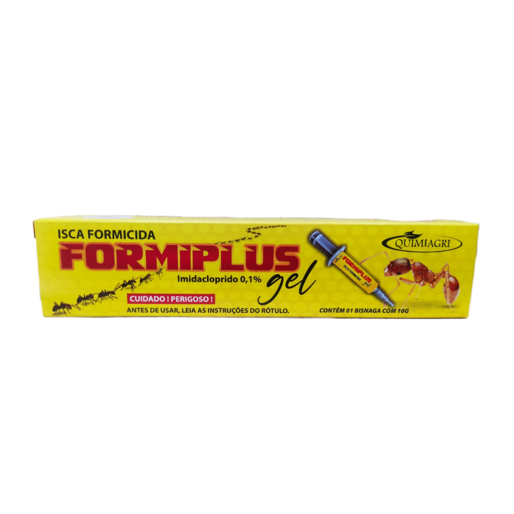 DESCRIÇÃO: Formiplus gel tem 20 anos de mercado, mantendo sempre a formulação, já bateu recorde de mais de 10.000.000 d eunidades vendidas. Um produto consagrado e de eficácia garantida. É um formicida pronto uso elaborado com IMIDACLOPRIDO, eficaz no controle de formigas das espécies Faraó (Monomorium floricola) e Fantasma (Tapinoma melanocephalum). DETALHES: - Quantidade: seringa de 10g - Indicado para: formigas - Marca: Quimiagri MODO DE USO: Aplicar pressionando o êmbolo da seringa para facilitar a saída do produto, formando filetes nos locais onde há indício da infestação dos insetos como: nos cantos dos armários, embaixo da pia, nos pés do fogão e geladeira, próximo aos aparelhos eletrônicos, frestas de azulejos e paredes, portas e janelas da cozinha, utilizando 3 g por m2 de área. Sempre ao lado do carreiro das formigas, nunca onde ela está passando. PRECAUÇÕES: - CUIDADO! PERIGOSA SUA INGESTÃO, INALAÇÃO OU ABSORÇÃO PELA PELE. - CONSERVE FORA DO ALCANCE DAS CRIANÇAS E DOS ANIMAIS DOMÉSTICOS. - Intervalo de tempo mínimo para reentrada nos locais de aplicação do produto: não se aplica pelo tipo de formulação. - Não aplicar sobre alimentos e utensílios de cozinha, plantas e aquários. - Não fumar ou comer durante a aplicação. - Manter o produto na embalagem original. - Não reutilizar as embalagens vazias. - Durante a aplicação não devem permanecer no local pessoas ou animais domésticos.