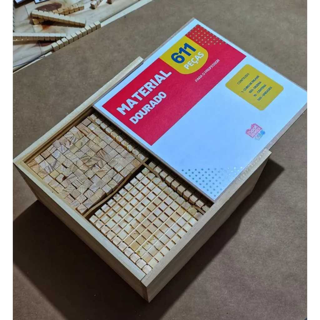 Material dourado 611 peças, feito em madeira de pinus com origem de reflorestamento. Criado por maria Montessori o material dourado tem o objetivo de auxiliar no aprendizado de matemática. BENEFÍCIOS: - Estimula o raciocínio lógico; - Facilita o aprendizado de conceitos matemáticos; - Ajuda a criança a compreender de forma lúdica e simples; - Contribui na socialização entre os alunos com a troca de conhecimentos; - Ajuda prática na realização das atividades.