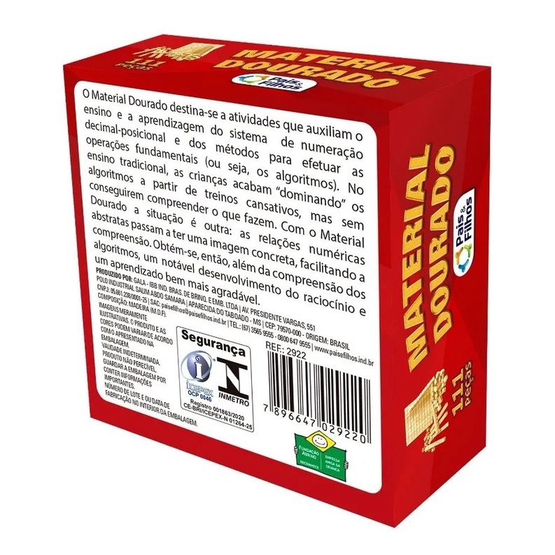 O "Material Dourado" desperta no aluno a concentração, o interesse, além de desenvolver sua inteligência e imaginação criadora, pois a criança, está sempre predisposta ao jogo. Além disso, permite o estabelecimento de relações de graduação e de proporções, e finalmente, ajuda a contar e a calcular. O material dourado é confeccionado em madeira ou eva, é composto por: cubos, placas, barras e cubinhos. O cubo é formado por dez placas, a placa por dez barras e a barra por dez cubinhos. Este material é de grande importância na numeração, e facilita a aprendizagem dos algoritmos da adição, subtração, multiplicação e divisão. Confeccionado em madeira111 Auxilia o aluno na compreensão e uso do sistema de numeração decimal e a desenvolver procedimentos de cálculo pela observação de regularidades e de propriedades das operações, principalmente na verificação de resultados. -----------------------------------------------------------Apresentação---------------------------------- A Quinzinho Brinquedos e Presentes trabalha com produtos de procedência no mercado garantindo uma experiência fantástica de compra. Produtos à pronta entrega em estoque físico, postagem dos produtos em 24 horas úteis para todo Brasil com Nota Fiscal