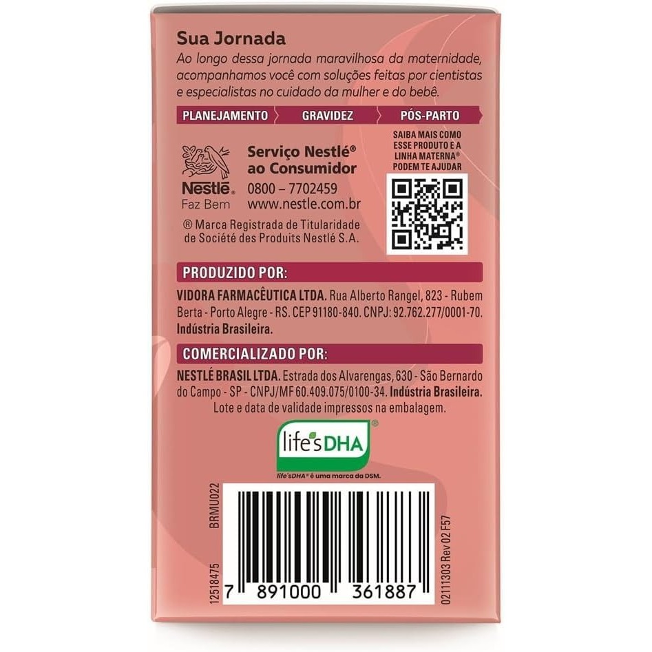 Descrição do Produto Materna Multi Vit DHA com 30 Comprimidos O Materna Multi Vit DHA foi desenvolvido especialmente para gestantes, oferecendo um complexo de vitaminas e minerais essenciais para o desenvolvimento saudável do bebê e para o bem-estar da mãe durante a gestação. Sua fórmula balanceada inclui DHA, um ácido graxo importante para o desenvolvimento cerebral e visual do feto. Principais Características • Completo em vitaminas e minerais: fornece nutrientes essenciais durante a gestação. • Contém DHA: contribui para o desenvolvimento cerebral e visual do bebê. • Fórmula prática em comprimidos: fácil de consumir diariamente. Benefícios • Auxilia na saúde materna, mantendo níveis adequados de vitaminas e minerais. • Contribui para o desenvolvimento do cérebro e visão do bebê. • Suporte nutricional completo para a gestante. • Praticidade e segurança no consumo diário. Diferenciais do Produto • Desenvolvido especificamente para gestantes, com nutrientes direcionados às necessidades da gravidez. • Inclui DHA, diferencial importante para o desenvolvimento fetal. • Embalagem com 30 comprimidos, ideal para o uso diário durante o mês. Especificações Técnicas • Tipo: Suplemento vitamínico e mineral para gestantes • Conteúdo: 30 comprimidos • Peso: não informado pelo fabricante Instruções de Uso • Tomar conforme orientação médica ou de nutricionista. • Geralmente recomendado 1 comprimido ao dia, preferencialmente junto às refeições. Avisos e Precauções • Uso exclusivo para gestantes ou sob orientação médica. • Manter fora do alcance de crianças. • Conservar em local fresco, seco e protegido da luz. • Não substituir o uso de alimentos variados e uma dieta equilibrada. O que está incluso? • 1 embalagem de Materna Multi Vit DHA com 30 comprimidos ---- DÚVIDAS FREQUENTES ---- Os produtos são originais? Sim. Todos os nossos produtos são originais. Emitem nota fiscal? Sim. Emitimos nota fiscal para todos os pedidos.