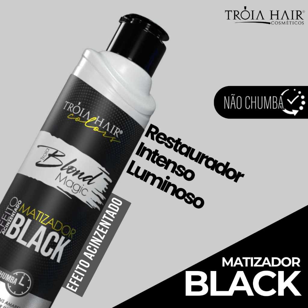 Matizador Tróia Blond Black 300ml – Efeito Acinzentado, Neutralização do Amarelado e Brilho Intenso Descrição do Produto O Matizador Tróia Blond Black foi especialmente desenvolvido para neutralizar tons amarelados e alaranjados, proporcionando um efeito acinzentado intenso e elegante aos fios loiros, platinados e grisalhos. Sua fórmula contém pigmentos pretos e violetas de alta performance, que atuam diretamente na fibra capilar, devolvendo o tom frio e luminoso, sem chumbar. Além de matizar, o produto hidrata, nutre e revitaliza os fios, mantendo-os sedosos, com brilho e toque macio desde a primeira aplicação. Benefícios Efeito Acinzentado Intenso, com reflexos frios e sofisticados. Neutraliza o amarelado e o alaranjado dos fios. Hidrata e nutre durante o processo de matização. Realça o brilho natural, deixando os fios luminosos. Evita o ressecamento e o chumbado. Garante resultado profissional e cor uniforme. Indicação de Uso ✔ Cabelos loiros, platinados, descoloridos ou grisalhos. ✔ Ideal para quem busca o efeito acinzentado moderno e brilho perolado. ✔ Pode ser usado por profissionais e consumidores domésticos. ✔ Recomendado para manutenção do loiro frio entre colorações. Modo de Uso Lave os cabelos com shampoo e retire o excesso de água. Aplique o Matizador Tróia Blond Black mecha por mecha. Deixe agir de 3 a 20 minutos, conforme a intensidade desejada do acinzentado. Enxágue completamente. Finalize com máscara ou condicionador hidratante da linha Blond Tróia Hair. Por que escolher o Tróia Blond Black? Porque oferece neutralização profunda e efeito acinzentado sofisticado, com brilho, maciez e vitalidade. É o matizador ideal para quem quer manter o loiro frio, elegante e saudável, com resultado profissional e duradouro. #MatizadorTróiaHair #TróiaBlondBlack #EfeitoAcinzentado #MatizadorLoiro #CabelosPlatinados #NeutralizadorDeAmarelado #MatizadorProfissional #TróiaHair #BlondMagic #CabeloLoiro