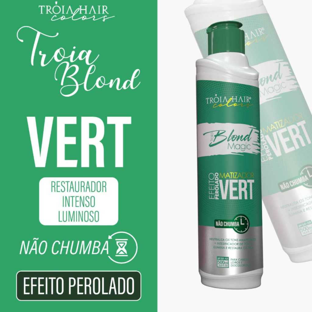 Matizador Tróia Blond Vert 300ml – Efeito Perolado, Neutralização e Brilho Intenso para Cabelos Loiros Descrição do Produto O Matizador Tróia Blond Vert foi desenvolvido para realçar o brilho dos cabelos loiros, descoloridos e grisalhos, proporcionando um efeito perolado luminoso e sofisticado. Sua fórmula exclusiva com pigmentos verdes e perolados atua neutralizando os reflexos indesejados, especialmente os tons amarelados e alaranjados, deixando o cabelo com um tom equilibrado, natural e com brilho espelhado. Além da matização, o produto hidrata e nutre profundamente os fios, mantendo a maciez, o movimento e o toque sedoso desde a primeira aplicação. Benefícios Efeito Perolado Intenso, com reflexos frios e luminosos. Neutraliza o amarelado e o alaranjado dos fios loiros. Hidrata e nutre profundamente durante a matização. Realça o brilho e o reflexo natural dos cabelos claros. Evita o ressecamento e mantém os fios saudáveis. Garante resultado profissional com cor viva e uniforme. Indicação de Uso ✔ Indicado para cabelos loiros, descoloridos, platinados e grisalhos. ✔ Ideal para quem deseja reflexos perolados e brilho sofisticado. ✔ Pode ser usado por profissionais e consumidores domésticos. ✔ Recomendado para manutenção da cor e neutralização de tons indesejados. Modo de Uso Lave os cabelos com shampoo e retire o excesso de água. Aplique o Matizador Tróia Blond Vert mecha por mecha. Deixe agir de 3 a 20 minutos, conforme o tom desejado e a porosidade dos fios. Enxágue completamente. Finalize com máscara ou condicionador da linha Blond Tróia Hair para selar as cutículas. Por que escolher o Tróia Blond Vert? Porque entrega neutralização precisa e brilho perolado encantador, mantendo o loiro saudável, iluminado e com aparência de salão. É o matizador ideal para quem busca reflexos elegantes, hidratação e cor equilibrada, sem chumbar os fios. #MatizadorTróiaHair #TróiaBlondVert #EfeitoPerolado #MatizadorLoiro #NeutralizadorDeAmarelado #CabelosPlatinados #MatizadorProfissional #TróiaHair #BlondMagic #CabeloLoiro