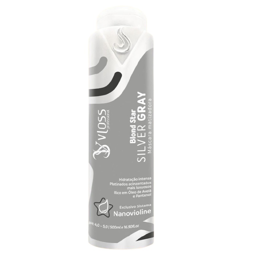 Silver Gray - Máscara Matizadora Black (Preta) para cabelos platinados que desejam tons acinzentados. Vloss Professional Blond Star - SILVER GRAY Efeito Platinado Acinzentado 500ml A Máscara Matizadora Silver Gray tem sua formulação enriquecida com Pantenol e Óleo de Avelã, que devolvem aos fios a elasticidade e a estruturação necessárias para permanecer sempre brilhosos e hidratados, além de gerar loiros platinados acinzentados luxuosos e espetaculares. Modo de Usar: Após Lavar os cabelos com Shampoo Blond Star Vloss, aplique a Máscara Matizadora Silver Gray sobre os cabelos úmidos do comprimento às pontas, massageando com suavidade. DEIXAR PAUSAR POR 5 MINUTOS e enxaguar com água em abundância. Embalagem de 500ml. Contém:01 - Matizador Vloss Silver Gray - Efeito Acizentado 500ml ***Imagem Ilustrativa***