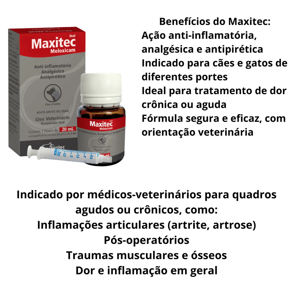 *PRODUTO NOVO ORIGINAL COM NOTA FISCAL ENVIADA POR E-MAIL E ANEXADA AO PACOTE! **Só trabalhamos com produtos de data de validade superior a NO MÍNIMO 90 dias. Cuide da saúde e bem-estar do seu pet com Maxitec 20 mL, um anti-inflamatório não esteroidal de uso veterinário formulado com Meloxicam, ideal para o tratamento de processos inflamatórios, dores e febres em cães e gatos. Indicado por médicos-veterinários para quadros agudos ou crônicos, como: Inflamações articulares (artrite, artrose) Pós-operatórios Traumas musculares e ósseos Dor e inflamação em geral Sua fórmula em suspensão oral proporciona fácil administração e absorção eficaz, garantindo alívio rápido e seguro. Acompanha seringa dosadora para aplicação precisa de acordo com o peso do animal. Benefícios do Maxitec: Ação anti-inflamatória, analgésica e antipirética Indicado para cães e gatos de diferentes portes Ideal para tratamento de dor crônica ou aguda Fórmula segura e eficaz, com orientação veterinária Especificações: Principio ativo: Meloxicam Apresentação: Frasco com 20 mL Via de administração: Oral Uso veterinário Acompanha seringa dosadora