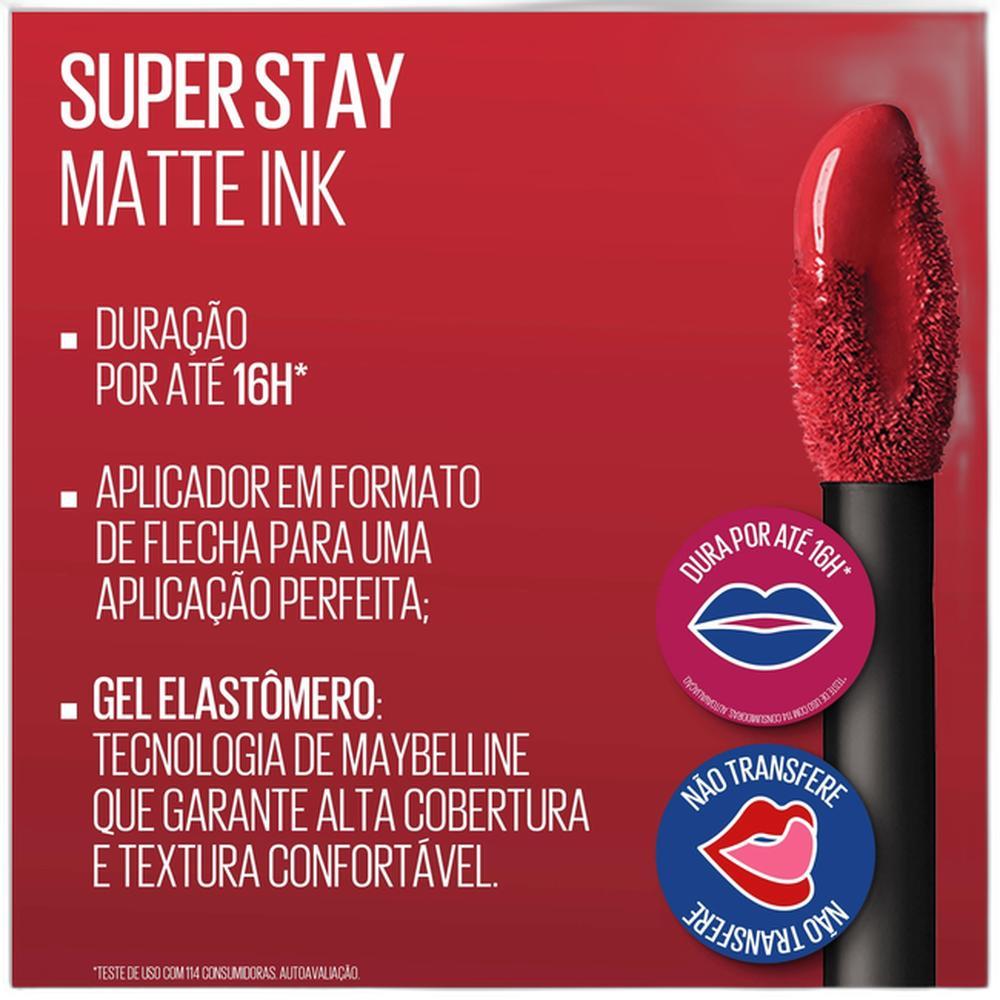Batom líquido com acabamento matte. Maybelline Superstay Matte Ink é a sua declaração de estilo e promessa de durabilidade. Com um acabamento matte impecável e cores super pigmentadas, este batom é o aliado perfeito para quem busca uma maquiagem marcante que dura o dia todo. O Batom Maybelline Superstay Matte Ink é a sua promessa de durabilidade e estilo. Com um acabamento matte impecável e cores super pigmentadas, ele garante um visual marcante por até 16 horas, sem necessidade de retoques. Sua fórmula inovadora, desenvolvida com formadores de filme e a tecnologia gel elastômero, proporciona conforto incomparável durante o uso, evitando a sensação de ressecamento. O exclusivo aplicador em formato de flecha foi desenhado para facilitar a aplicação, permitindo um contorno labial preciso e uma cobertura perfeita com apenas uma fina camada. É A escolha ideal para quem busca beleza, sofisticação e praticidade. Benefícios de Batom Maybelline Superstay Matte Ink: ▸ Longa duração de até 16 horas, garantindo um visual impecável o dia todo.▸ Acabamento matte confortável com cores super pigmentadas e intensas.▸ Aplicador exclusivo em formato de flecha que permite um contorno preciso.▸ Fórmula com tecnologia gel elastômero que não craquela e não resseca os lábios.▸ Não necessita de retoques frequentes, oferecendo praticidade para sua rotina. **** IMPORTANTE: Não vendemos para contas CNPJ, evite que seu pedido seja cancelado! ****