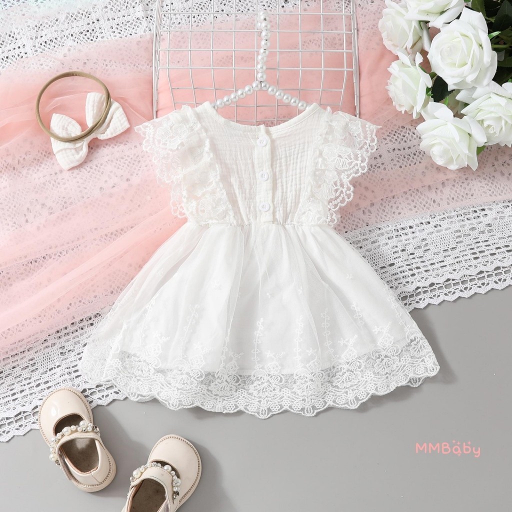 Mbaby-Baby Girl De 2 Peças Manga De Mosca Tripulação De Pescoço Renda Vestido De Princesa Com Fita De Cabeça Conjunto De