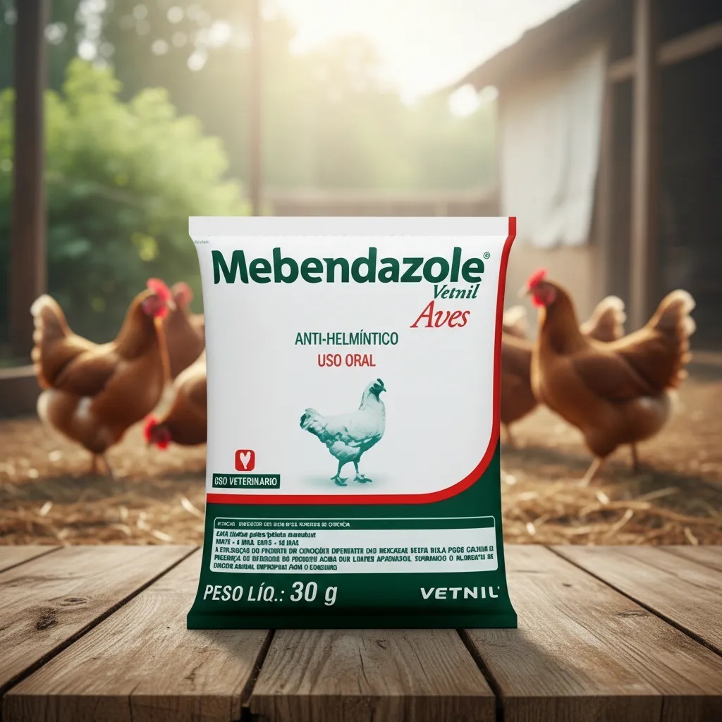 Mebendazole Vetnil (Pó) - Proteção Total para sua Criação Produto: Vermífugo oral em pó (sachê). Indicação: Aves (corte, postura e ornamentais) Ação: Combate vermes do intestino e do pulmão (Gogo). Rendimento: 1 sachê de 30g trata até 20kg de ração. Tratamento: Fornecer por 3 a 5 dias seguidos. Resultado: Animais mais fortes, com melhor conversão alimentar e penas saudáveis. Fabricante: Vetnil (Líder em saúde animal).