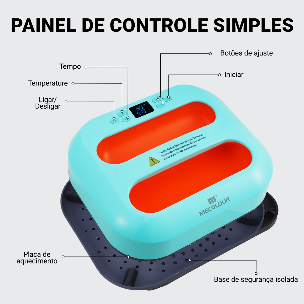 🔥 Prensa Térmica MECOLOUR 25x30cm Potência, precisão e versatilidade para personalização profissional Leve sua criatividade para o próximo nível com a prensa térmica 25x30cm – ideal para quem deseja produzir estampas de alta qualidade em casa ou para vender. ⭐ 5 Principais Benefícios 1️⃣ Área Grande 25x30cm – Mais Produtividade Placa ampla que permite estampar áreas maiores de uma só vez, ideal para camisetas e projetos maiores. 2️⃣ Aquecimento Uniforme – Resultado Perfeito Distribuição de calor homogênea em toda a superfície, garantindo: ✔ estampas sem falhas ✔ melhor fixação ✔ acabamento profissional 3️⃣ Controle Digital Preciso Ajuste facilmente: ✔ temperatura ✔ tempo (0–600s) Evita danos ao tecido e garante máxima aderência da estampa. 4️⃣ Segurança Inteligente ✔ Base isolante anti-queimadura ✔ Desligamento automático após 10 minutos Mais segurança durante o uso diário. 5️⃣ Uso Versátil – Ideal para Negócios e DIY Perfeita para diversos materiais: ✔ camisetas e moletons ✔ bolsas e ecobags ✔ almofadas e acessórios ✔ chapéus e muito mais Compatível com Sublimação, HTV e DTF. 📦 Especificações Técnicas • Marca: MECOLOUR • Voltagem: 110V / 220V • Tamanho da placa: 25 x 30 cm • Tempo ajustável: 0–600 segundos • Dimensões da embalagem: 17 x 33 x 36 cm • Peso: 3,75 kg 📦 Conteúdo da Embalagem • 1x Prensa térmica (Azul Turquesa) • 1x Base de segurança isolante • 1x Manual de instruções • 1x Cabo de energia (180 cm) 🛡️ Garantia • Garantia do vendedor: 3 meses