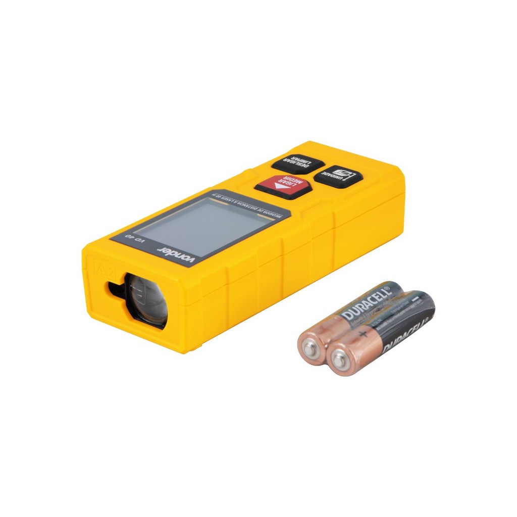 Indicado para ambientes internos. Realiza medições de distância contínua (trena eletrônica), área, volume, Pitágoras. Desligamento automático do laser em 20 segundos e do aparelho em 180 segundos. Possui indicador de nível de carga das pilhas. É extremamente leve e pequeno, facilitando a portabilidade e o manuseio. Possui 2 pontos de referência para medição: frontal e traseiro. Conteúdo da Embalagem: -1 Medidor de distância a laser. Acompanha: 2 pilhas AAA. Detalhes técnicos: -Modelo: VD 40 -Faixa de medição: 0,05 m a 40 m -Precisão: +/- 2,0 mm -Unidades de medida: Sistema métrico, polegada fracionária e pé. -Tipo de medição: Medição de distância, área, volume e Pitágoras. -Comprimento da onda do medidor de distância a laser (nm): 630 nm - 670 nm -Resolução na unidade metros: 0,001 m -Classe do laser do medidor de distância: Classe 02 -Cor de feixe do laser: Vermelho -Potência do laser: < 1 mW -Alimentação: 2 Pilhas AAA alcalinas de 1,5 V -Temperatura de trabalho: 0°C a 40°C -Comprimento do medidor de distância a laser: 104 mm -Largura do medidor de distância a laser: 43 mm -Espessura do medidor de distância a laser: 25,5 mm -Massa aproximada (peso): 0,100 kg