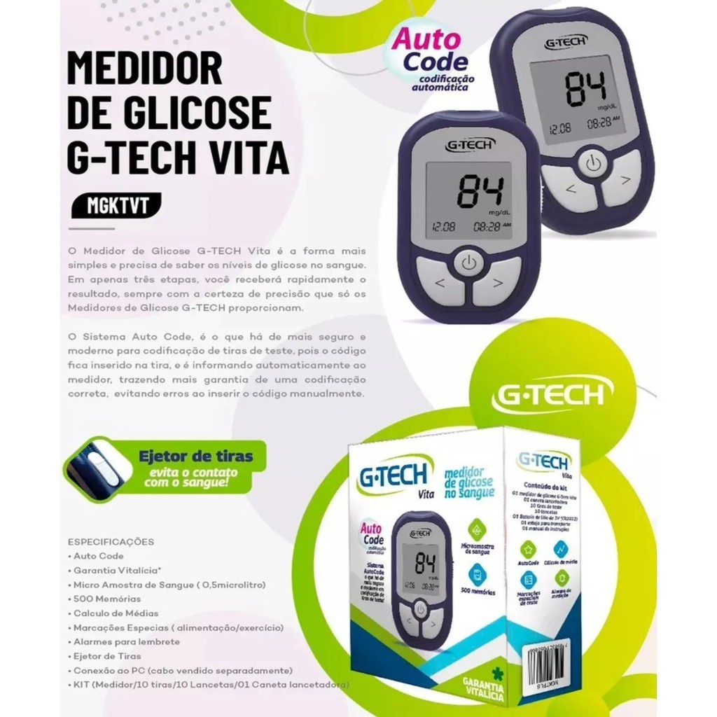Medidor de glicose G-Tech Vita O Medidor de glicose G-Tech Vita é um medidor de glicose que irá transformar o seu controle dos níveis de glicose no sangue de forma mais simples, rápida e precisa. Com garantia vitalícia, memória para até 500 resultados, alarmes, ejetor de tiras e diversas outras funções, o G-Tech Vita tem tudo o que você precisa para tornar seu controle da glicose muito mais completo. Em apenas três etapas você recebe rapidamente o resultado, sempre com a certeza de precisão que só os medidores de glicose G-Tech podem proporcionar. O sistema AutoCode é o que há de mais seguro e moderno para utilização de tiras de teste. Cada tira possui um código interno que é automaticamente reconhecido e ajustado pelo aparelho, sem a necessidade de qualquer interferência do usuário. Este sistema proporciona um resultado ainda mais preciso que outros sistemas sem código e elimina a possibilidade de resultados incorretos oriundos de erro na codificação manual. - Sistema AutoCode: o aparelho reconhece automaticamente a codificação das tiras - Memória para 500 medições com média automática (7, 14 e 30 dias) - Microamostra de sangue: apenas 0.5 microlitros - Cálculo automático de médias dos resultados armazenados - Permite a configuração de alarme para lembrete de realização de teste - Conecta-se ao computador para uma análise mais profunda dos resultados¹ - Possibilidade de marcações especiais de teste, auxiliando na avaliação - Sistema ejetor de tiras que evita o contato com a tira já utilizada Garantia vitalícia.