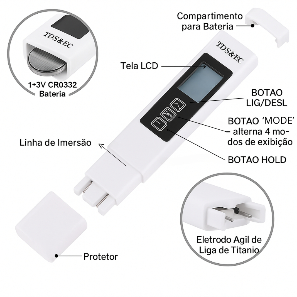 Medidor de Condutividade TDS EC Temperatura Digital Portátil Alta Precisão Faixa de TDS: 0 a 9999 ppm Faixa de condutividade: 0 a 9999 µS/cm Faixa de temperatura: 0 a 80 graus Celsius Compensação automática de temperatura Precisão: mais ou menos 2 por cento Alimentação: 1 pilha LR44 inclusa Desligamento automático após 5 minutos Dimensões aproximadas: 15x3x2cm MODO DE USO Remova a tampa protetora do sensor Pressione o botão liga/desliga para ativar o aparelho Mergulhe o sensor na solução a ser medida, respeitando o limite de imersão Aguarde a estabilização da leitura Caso deseje, pressione o botão hold para travar a leitura Retire o aparelho da solução para visualizar melhor os resultados Após o uso, seque bem o sensor, desligue o aparelho e recoloque a tampa Pressione o botão "MODE" para alternar entre os seguintes modos de exibição: Modo 1: ppm + °C Modo 2: µS/cm + °C Modo 3: ppm + °F Modo 4: µS/cm + °F O aparelho possui memória: ao ligá-lo novamente, ele iniciará no último modo utilizado. CUIDADOS IMPORTANTES Mantenha o sensor sempre limpo e seco após o uso Não exponha o aparelho à luz solar direta ou altas temperaturas O produto não é à prova d’água Nunca ultrapasse o limite de imersão indicado no corpo do medidor Retire a pilha se não for utilizar o aparelho por um longo período Para melhor desempenho, utilize soluções padrão de calibração. Medição precisa de TDS, condutividade elétrica e temperatura Compensação automática de temperatura Função hold para travar a leitura Desligamento automático para economia de bateria Tela digital de fácil leitura Ideal para uso em aquários, hidroponia, laboratórios, indústrias, entre outros