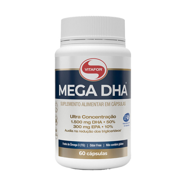 INFORMAÇÕES DE DESTAQUE: • Certificação do Programa Internacional de Padrões de Óleo de Peixe (IFOS ™). Definindo os padrões mais altos do mundo em pureza, potência e frescor; • Fonte de Ômega 3 (TG) maior absorção e conforto gástrico; • Extraído de águas frias e profundas de regiões polares; • Possui ultra concentração dos derivados de ômega3: DHA (ácido docosaexaenoico) 1500 mg e 300 mg de EPA (ácido eicosapentaenóico) • Odor Free; • Selo de Qualidade VLabor. DESCRIÇÃO: Experimente o Mega DHA da Vitafor e transforme sua saúde com os benefícios superiores de um produto certificado pelo Programa Internacional de Padrões de Óleo de Peixe (IFOS ™). Com pureza, potência e frescor inigualáveis, este suplemento é uma fonte de Ômega 3 (TG), garantindo maior absorção e conforto gástrico. Extraído de águas frias e profundas de regiões polares, ele oferece ultra concentração de DHA e EPA, essenciais para o bem-estar. Desfrute de um produto sem odor, com Selo de Qualidade VLabor, que auxilia na redução dos triglicerídeos, melhora a saúde do coração, apoia a saúde mental, reduz a inflamação e aprimora a visão. Sinta a diferença com cada cápsula! COMPOSIÇÃO: Óleo de peixe. Composição da cápsula: gelatina, água e umectante glicerina. Não contém glúten. Alérgicos: Contém peixe, pode conter soja. SUGESTÃO DE USO: Suplemento alimentar de uso adulto (a partir de 19 anos de idade): ingerir 4,5 g (3 cápsulas) ao dia antes das refeições ou seguir a recomendação de um profissional da saúde. NÃO EXCEDER A RECOMENDAÇÃO DIÁRIA DE CONSUMO INDICADA NA EMBALAGEM. MANTENHA FORA DO ALCANCE DE CRIANÇAS. ESTE PRODUTO NÃO É UM MEDICAMENTO.