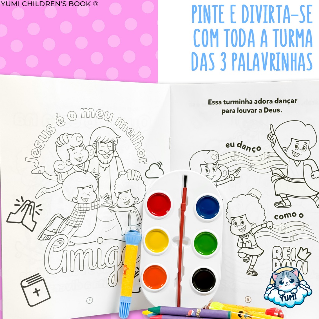 Mega Kit Colorir 3 Palavrinhas - Livro Infantil De Colorir + Canetinhas + Carimbos + Giz + Jogo Educativo Oficial