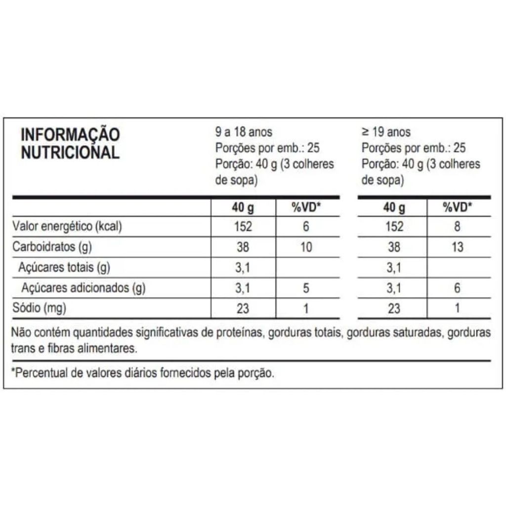 Mega Maltodextrin® – Suplemento Energético para Treinos Intensos Mega Maltodextrin® é um suplemento energético desenvolvido especialmente para atletas e praticantes de atividades físicas que necessitam de suporte energético durante treinos prolongados e de alta intensidade. Formulado com maltodextrina, um carboidrato de absorção rápida, ele contribui para a ressíntese de glicogênio, melhora o desempenho físico e retarda a fadiga muscular. Benefícios principais: - Aporte energético imediato para treinos intensos e de longa duração. - Reposição eficaz de glicogênio muscular, essencial para o rendimento esportivo. - Aumento da resistência física, evitando queda de performance por fadiga. - Auxílio na recuperação muscular pós-exercício. - Versatilidade de consumo, podendo ser ingerido antes, durante ou após o treino. Ingredientes por sabor: Guaraná com Açaí: - Maltodextrina - Polpa de açaí em pó - Acidulante ácido cítrico - Aromatizantes - Corantes caramelo IV, amaranto e azul brilhante FCF - Edulcorante sucralose Laranja: - Maltodextrina - Acidulante ácido cítrico - Aromatizante - Corante natural urucum - Edulcorantes sucralose e acessulfame de potássio Morango Silvestre: - Maltodextrina - Acidulante ácido cítrico - Aromatizante - Edulcorante sucralose - Corantes artificiais amaranto e azul brilhante FCF Todos os sabores: - Não contém glúten - Não contém lactose Modo de preparo: Adicione 3 colheres de sopa cheias (aproximadamente 40g) a 250 mL de água gelada. Misture bem ou utilize um liquidificador para melhor homogeneização. Consuma conforme orientação nutricional, preferencialmente antes ou durante o exercício físico. Recomendações de uso: - Indicado para pessoas de 9 a 18 anos e maiores de 19 anos. - Produto dispensado de registro na ANVISA conforme RDC nº 27/2010. - O consumo deve estar aliado a uma alimentação equilibrada e acompanhamento profissional. Informações adicionais: - Alergênicos: Pode conter leite, ovo e soja. - Produto livre de glúten e lactose. - Disponível em embalagem de 1 kg.
