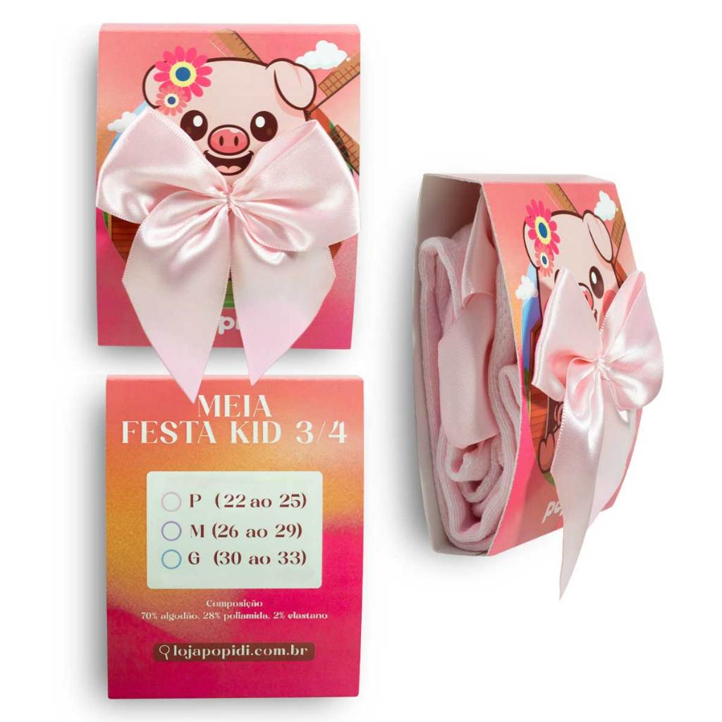 MEIA FESTA 3/4 Tamanho da Forma: Normal - Recomendamos que compre o tamanho padrão de uso, para melhor calce e maior conforto. Cores Disponíveis: • ROSA • BRANCO • PRETO Especificação Técnica: • Tipo de produto: Meia ¾ Infantil. • Composição: 70% Algodão, 28% Poliamida, 2% Elastano. • Peso médio do produto: 49g. • Numeração: Será enviada pelo critério de escolha. • Embalagem: Esse produto não é entregue em caixa individual. Tabela de Medidas: 22 ao 25 ---------------- 11,6 largura x 22,2 altura (cano) cm (P) 26 ao 29 ---------------- 12,2 largura x 24,00 altura (cano) cm (M) 30 ao 33 ---------------- 15,5 largura x 25,5 altura (cano) cm (G) Como Medir: Coloque o pé em cima de uma folha de papel e risque em volta dele com um lápis ou caneta. Meça o comprimento do topo até a base do contorno e adicione 0,5 cm de folga. Limpeza e Conservação: Evite usar substâncias abrasivas como álcool ou alvejantes nas meias, use produtos neutros. Nunca lave na máquina ou use secadora, a secagem deve ser feita em temperatura ambiente e na sombra, nunca no sol. Dicas Pópidi A meia festa 3/4 é perfeita para incrementar um look fofo e estiloso. Ideal para usar com tênis, sapatilhas e se quiser algo diferente, aposte em galochas. Esse modelo possui um detalhe de laço em cetim na lateral externa, ótima opção para usar com looks mais despojados, como um shortinho ou sainha jeans. Arrase nas combinações! Sobre a Marca: Conectados com o universo infantil através de produtos que transmitem nossos valores, a Pópidi acompanha o dia a dia da criança com muito respeito, dedicação e atitude, desde o nascimento até a pré-adolescência. Oferecemos proteção, conforto e estilo, buscando sempre inovar a cada lançamento. Cuidando com excelência da relação pré e pós-vendas, afinal a satisfação de nossos clientes é muito importante para nós. Atendimento: Segunda à sexta: 07:00 às 17:30 Sábado: 08:00 às 12:00 Boas compras e volte sempre!!!