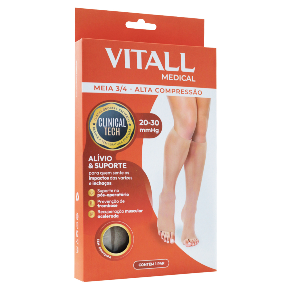 Meia 3/4 Vitall Medical 1881 Sem Ponteira Alta Compressão Pós Cirurgico A meia Vitall 3/4 sem ponteira de alta compressão foi desenvolvida para oferecer suporte intenso, conforto e segurança para as pernas no dia a dia, especialmente em casos de varizes mais avançadas, inchaços frequentes ou após procedimentos médicos. Confeccionada com material de alta resistência e toque suave, proporciona ajuste anatômico firme e eficaz, sem comprometer o conforto. O modelo sem ponteira permite maior ventilação e liberdade nos dedos, sendo ideal para quem busca alívio e bem-estar com máxima compressão. Indicação de uso: - Cansaço e sensação de peso nas pernas - Melhora da circulação sanguínea - Varizes e inchaços - Longos períodos em pé ou sentado - Recuperação muscular pós-exercícios. Contraindicações: - Problemas de insuficiência arterial - Infecções dermatológicas - Sensibilidade aos materiais da composição - Gangrena - Pele em processo de cicatrização Composição: 90% Poliamida 10% Elastano Disponível nos tamanhos P, M, G e GG é a escolha certa para quem busca desempenho com conforto.