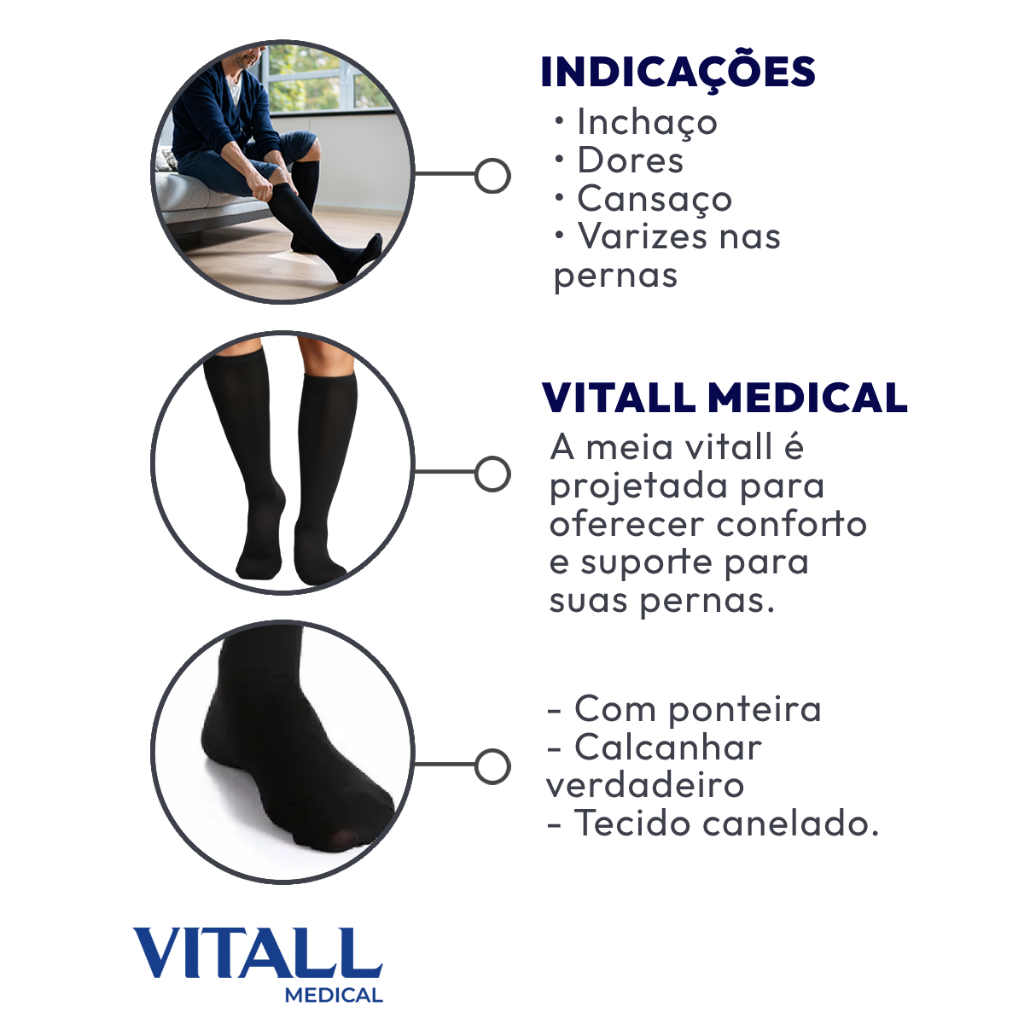 Meia 3/4 Vitall Medical Média Compressão A meia Vitall com ponteira foi desenvolvida para proporcionar conforto, suporte e proteção ás pernas em situações do cotidiano que exigem longos períodos em pé ou sentado. Confeccionada com material de alta qualidade e toque suave, oferece ajuste anatômico que acompanha o formato da perna sem apertar excessivamente. O modelo com ponteira garante mais ventilação e liberdade para os dedos dos pés. Indicação de uso: - Cansaço e sensação de peso nas pernas - Melhora da circulação sanguínea - Varizes e inchaços - Longos períodos em pé ou sentado - Recuperação muscular pós-exercícios. Contraindicações: - Problemas de insuficiência arterial - Infecções dermatológicas - Sensibilidade aos materiais da composição - Gangrena - Pele em processo de cicatrização Composição: 90% Poliamida 10% Elastano Disponível nos tamanhos P, M, G e GG é a escolha certa para quem busca desempenho com conforto