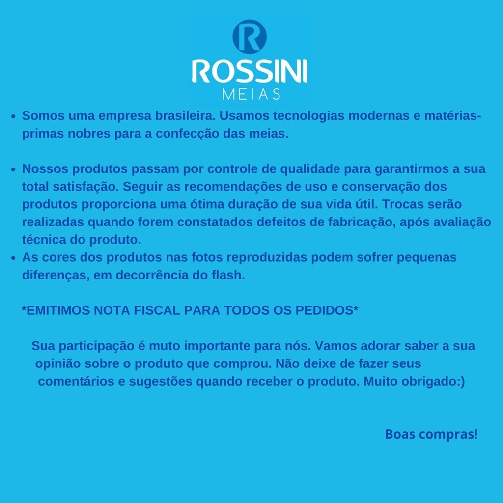 As meias bebê são fabricadas com todo cuidado e carinho para o conforto do seu bebê. É confeccionado em malha leve com grande percentual de algodão que é uma fibra natural, antialérgica e macia para não irritar a pele sensível do seu bebê. Com detalhes e estampas delicadas é um mimo perfeito para presentear e super fofo para o enxoval da sua princesa e do seu príncipe! EMBALAGEM: Os pares são embalados individualmente: 1 tag + etiqueta de barras + saquinho plástico TECNOLOGIA E ACABAMENTOS: Punho Dobrado: o punho é suave e não aperta a perna, podendo ser usado aberto ou dobrado. Calcanhar verdadeiro: calcanhar anatômico que permite ajuste perfeito nos pés. COMPOSIÇÃO: 79% Algodão, 18% Poliamida, 3% Elastano TABELA DE TAMANHOS: Tam U = 0 a 4 meses CONSERVAÇÃO DA PEÇA: Lavar a mão em água fria. Não usar alvejantes e cloro. Não torcer. Não secar em secadoras. Secar a sombra preserva a cor e o tecido. Não passar a ferro pois pode danificar o tecido. Não lavar a seco. A ROSSINI tem uma linha de meias para festas e batizado para a sua princesa e seu príncipe. Continue navegando em nossa loja e conheça outras peças para você e sua família!