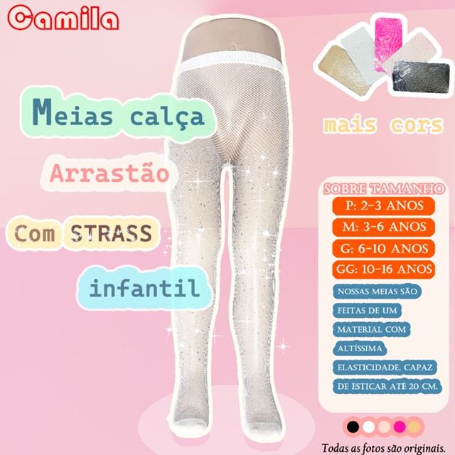 | Meia Calça Arrastão Com Strass Brilho Infantil Festa e Dança Camila... este produto | R$ 11,04 | 31% | 4.9/5 | 372 |