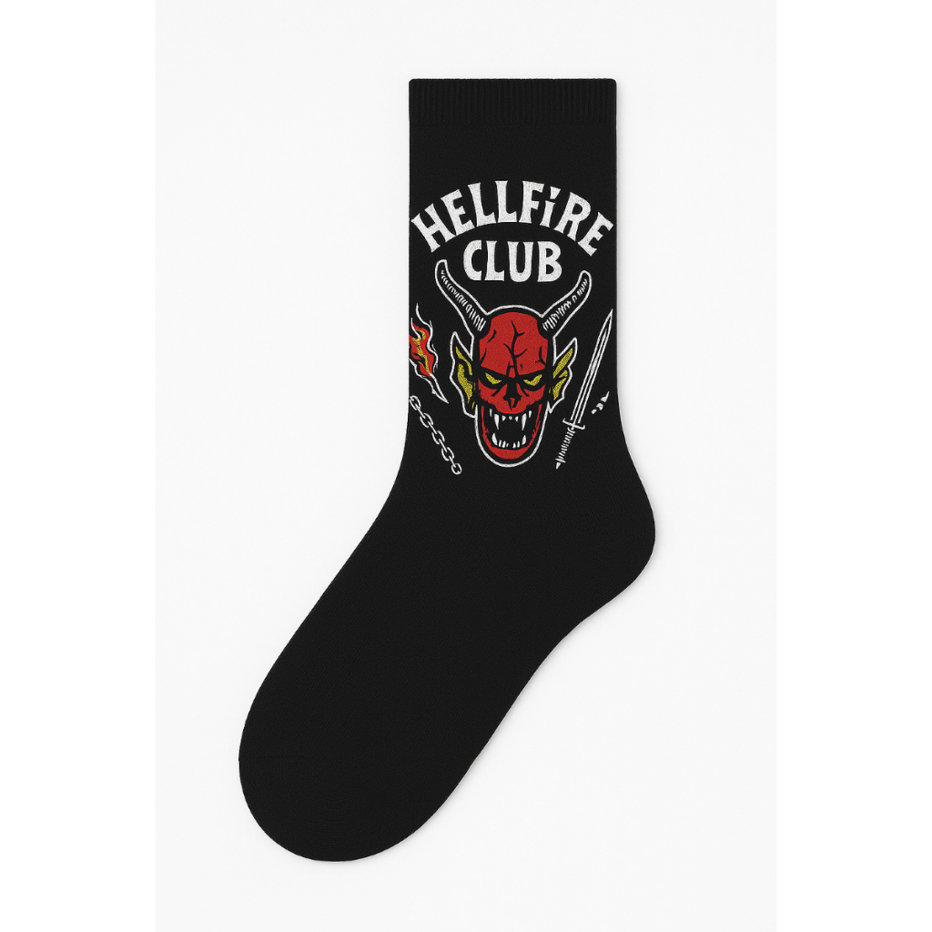 Meia Cano Médio Hellfire Unissex Algodão. Cano Médio, algodão, estampa série Stranger Things Hellfire Club. Peça calça do 35 ao 41 confortavelmente. Pronta entrega e entrega rápida para todo Brasil.