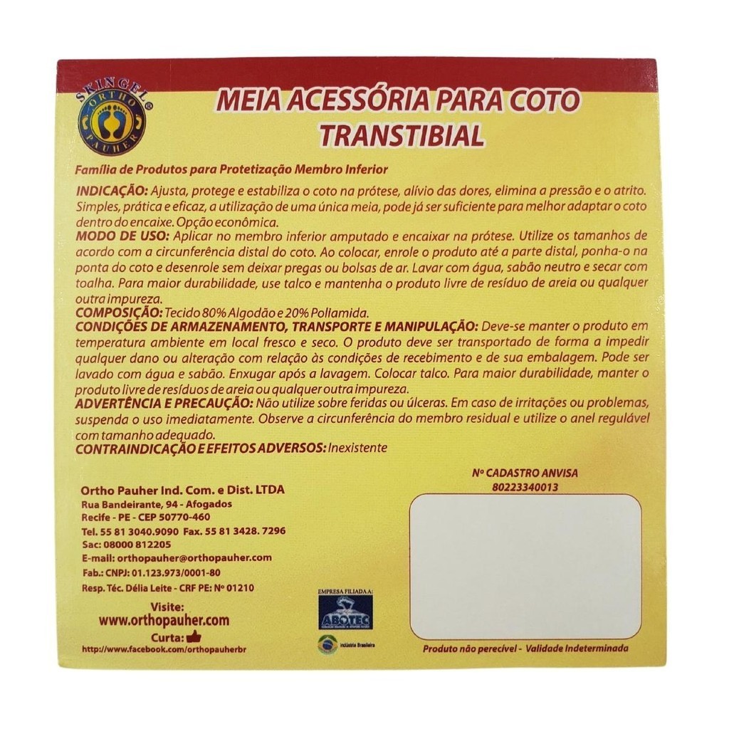 MEIA PARA AMPUTAÇÃO TRANSTIBIAL - ORTHO PAUHER Produto com Selo ANVISA de Qualidade e Eficiência N°: 80223340013 A Meia Transtibial OrthoPauher Ajusta, protege e estabiliza o coto na prótese, alívio das dores, elimina a pressão e o atrito. Simples, prática e eficaz, a utilização de uma única meia, pode já ser suficiente para melhor adaptar o coto dentro do encaixe. Opção econômica. Principais Características: - Alívio imediato das dores, elimina a pressão e o atrito - Macia, resistente e protetora - Opção econômica, considerando que uma única meia, pode já ser suficiente para melhor adaptar o coto dentro do encaixe Tamanho (Comprimento e Largura da Meia): P - 35 x 8,5 cm M - 40 x 9,5 cm G - 45 x 10 cm Produto com Selo ANVISA de Qualidade e Eficiência N°: 80223340013 Composição: 80% algodão e 20% poliamida