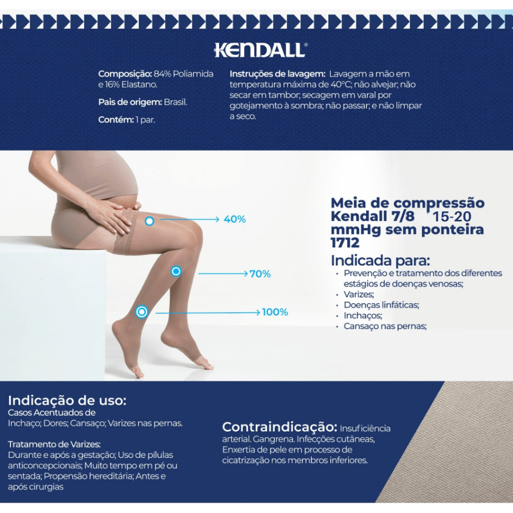Meia Kendall 7/8 Com Silicone Média Compressão Sem Ponteira 1712 Meia 7/8 com Silicone SEM PONTEIRA Média Compressão 15-20 mmHg Kendall Modelo: 1712 Indicações: Antes e após cirurgias Casos acentuados de inchaço, dores e cansaço nas pernas Muito tempo em pé ou sentada Propensão hereditária Uso de pílulas anticoncepcionais Varizes nas pernas Benefícios adicionais na sua meia Kendall®: Máxima proteção contra fungos e bactérias Prevenção de odores desagradáveis Conforto térmico Frescor e absorve a umidade da sua pele Contraindicações: Insuficiência arterial (dificuldade de circulação do sangue nas artérias com conseqüente obstrução caracterizada no seu grau mais extremo pela gangrena). Gangrena (morte tecidual da extremidade com conseqüente mudança de coloração da pele, chegando a ficar negra e mal cheirosa). Infecções cutâneas (proliferação de fungos ou bactérias, causando alterações de coloração ou feridas com localização entre os dedos ou demais territórios das pernas. Exemplo: erisipela fase aguda, frieiras e ferimentos purulentos com presença de pus). ?Dermatoses úmidas (lesões da pele com secreção acentuada). Enxertia de pele em processo de cicatrização nos membros inferiores (pacientes com queimaduras graves ou feridas que necessitam de cobertura de pele de outra região, numa fase recente até 30 dias). Tecnologia Ultra Pro Nova geração do conforto! UltraPro: Dupla Tecnologia em um único produto! A Kendall, pioneira na aplicação de bacteriostáticos em seu produto, foi buscar novas tecnologias para proporcionar a você um conforto ainda maior: Nossa Pele é nossa Interface com o Mundo! Através da nossa pele sentimos: Temperatura, Umidade e Movimento do ar Todos estes fatores impactam nosso senso de conforto! A Tecnologia UltraPro, além de adaptar-se a temperatura aumentando e diminuindo a sensação de frescor dependendo do ambiente e atividades, é um agente antimicrobiano que age evitando o crescimento de microrganismos como bactérias e fungos causadores de odores desagradáveis nos artigos têxteis, proporcionando uma proteção duradoura e higiênica, conferindo a sensação de bem-estar e comodidade. Composição 86% poliamida 14% Elástano COR: MEL E CASTANHO TAMANHOS DISPONÍVEIS: M, G e GG