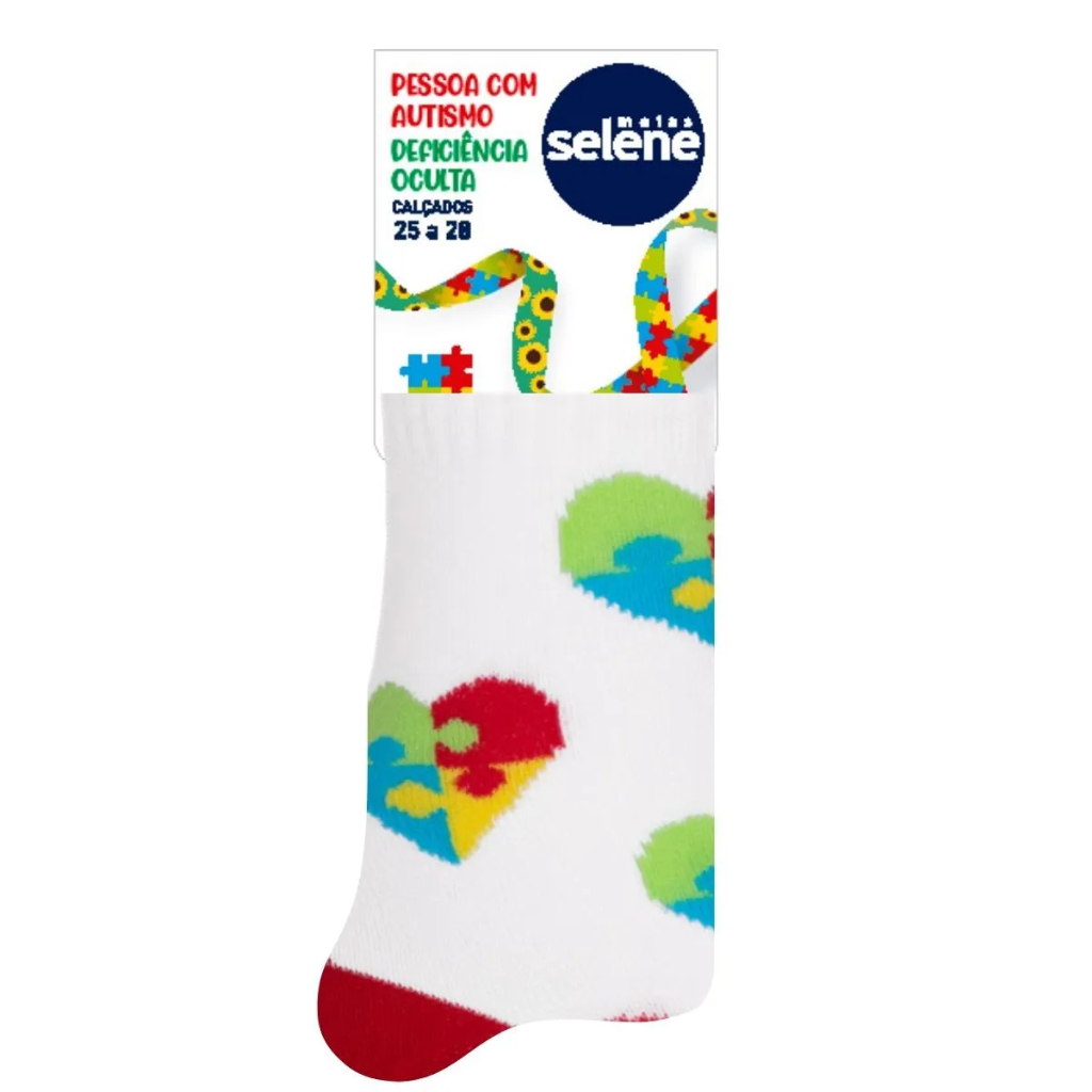 🧩 Meia Pessoa com Autismo – Selene | Cano Alto Espalhe conscientização e inclusão com as meias temáticas Selene Pessoa com Autismo 🧦💙. Com design exclusivo e confortável, este modelo traz o símbolo do quebra-cabeça, que representa o TEA (Transtorno do Espectro Autista) e reforça a importância de compreender e acolher pessoas com deficiências ocultas. ✨ Características: 🧦 Marca: Selene 🧩 Tema: Pessoa com Autismo / Deficiências Ocultas 👟 Cano: Alto 🎨 Cores disponíveis: Branco/Vermelho Branco/Turquesa 📏 Tamanhos: Tamanho 1: Calçados 25 a 28 Tamanho 2: Calçados 29 a 34 Tamanho 3: Calçados 34 a 38 🛍️ Opções de compra: 1 par ou kit com 2 pares 💎 Composição: Material macio e resistente, proporcionando conforto e durabilidade 💙 Ideal para quem deseja demonstrar apoio à causa do autismo e vestir empatia no dia a dia!
