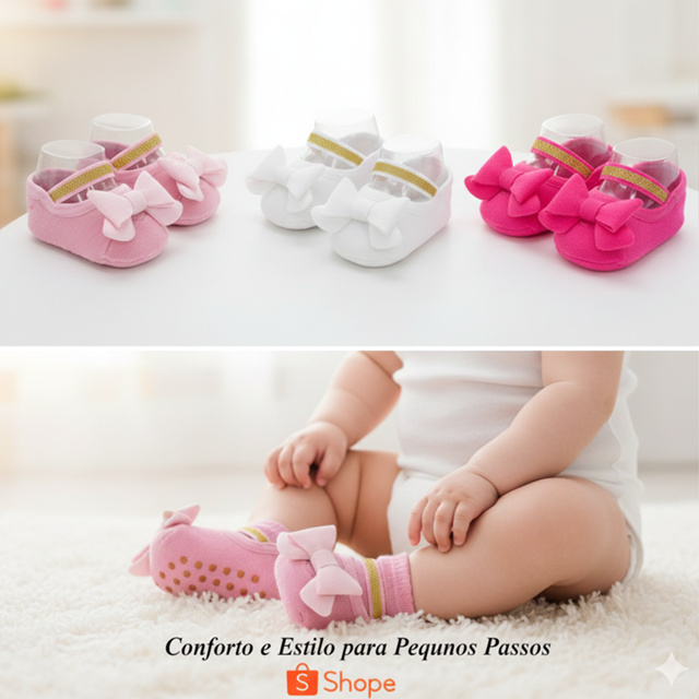 Meia Sapatilha Infantil Antiderrapante RN a 2 Anos - Bebê Menina Laço Conforto e Segurança
