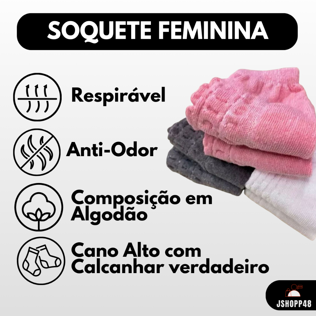 Kit com 06 12 ou 18 Pares de meias feminina soquete algodão Ideal para quem busca por conforto, alta absorção de suor e performance para o dia a dia. Kits disponíveis: 06,12 e 18 pares Cor: sortido entre - branco, cinza, rosa ou preta (não é possível escolher) Veste: do 33 ao 38 Composição: 80% Algodão 15%Poliéster e 5% Elastano Feminina - Adulto Bem-vindo à nossa loja JMCodigital, onde a diversão e o conforto se encontram! Explore nossa vasta coleção de meias coloridas e estilosas, perfeitas para expressar sua personalidade única a cada passo. Além disso, oferecemos uma seleção de acessórios para casa e caixas de som de alta qualidade. E não se esqueça dos brinquedos que vão alegrar corações de todas as idades. Navegue por nossos corredores virtuais e descubra em cada categoria que temos a oferecer! ***IMPORTANTE: Devido à alta demanda NÃO é possível realizar alterações ou ajustes nas quantidades, cores e tamanhos após a compra. Todas as escolhas devem ser feitas diretamente no anúncio, no momento de realizar o seu pedido.***