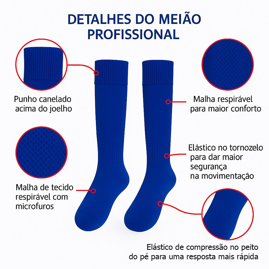 Meião De futebol Profissional Esportivo De Alta Qualidade Cano Alto Projetado para atletas que não abrem mão de performance, durabilidade e estilo, o meião de futebol profissional cano alto oferece suporte completo para jogos intensos e treinos exigentes. Com design moderno nas cores preto, branco e azul, ele combina tecnologia avançada e conforto ergonômico para garantir o melhor desempenho dentro de campo. Fabricado com fibras sintéticas de alta qualidade, como Poliéster e elastano, proporciona compressão estratégica, excelente respirabilidade e ajuste anatômico da panturrilha ao pé. O tecido leve, resistente e elástico acompanha os movimentos do corpo, mantendo a estabilidade sem limitar a mobilidade. Diferenciais Técnicos: ✅ Cano alto com compressão graduada: Oferece firmeza na região da panturrilha, melhora a circulação sanguínea e mantém a caneleira no lugar durante todo o jogo. ✅ Ventilação inteligente: Malha com tramas abertas em pontos específicos (como peito do pé e lateral da perna) para maior ventilação e controle térmico, evitando o acúmulo de suor. ✅ Reforço em áreas de impacto: Calcanhar, sola e dedos recebem acolchoamento extra, aumentando a proteção contra atrito, impactos e formação de bolhas. ✅ Ajuste anatômico com faixa elástica superior: Desenvolvido para os pés direito e esquerdo, com modelagem que garante fixação sem desconforto. ✅ Costura plana e acabamento reforçado: Conforto extremo mesmo em uso prolongado, com maior durabilidade. Composição: 98% Poliéster 2% Elastano Cores disponíveis: ⚫ Preto clássico – ideal para uniformes sóbrios e elegantes ⚪ Branco clean – perfeito para um visual leve e profissional 🔵 Azul vibrante – para quem quer destacar-se com personalidade e energia Indicado para: Jogadores profissionais e amadores que buscam um meião de alta performance para partidas oficiais, treinos técnicos ou jogos recreativos, em campo natural ou sintético.