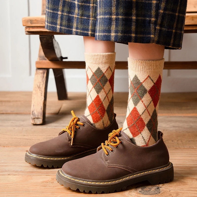 Meias De Estilo Vintage College Versáteis De Tubo Médio/Xadrez Diamante Casuais De Moda De Alta Qualidade
