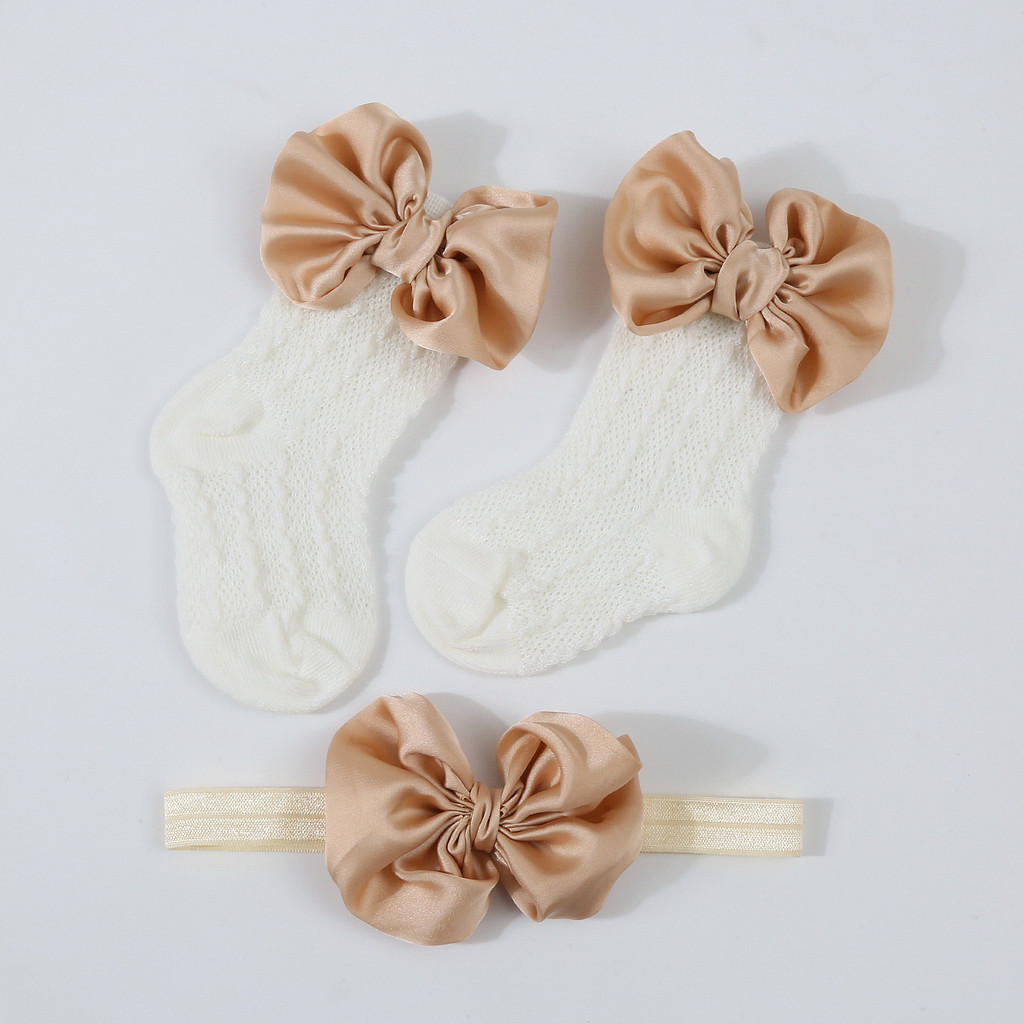Meias De Malha Jacquard Vazadas Para Bebê , Cor Sólida , Com Laço Grande + Conjunto De Faixa De Cabelo