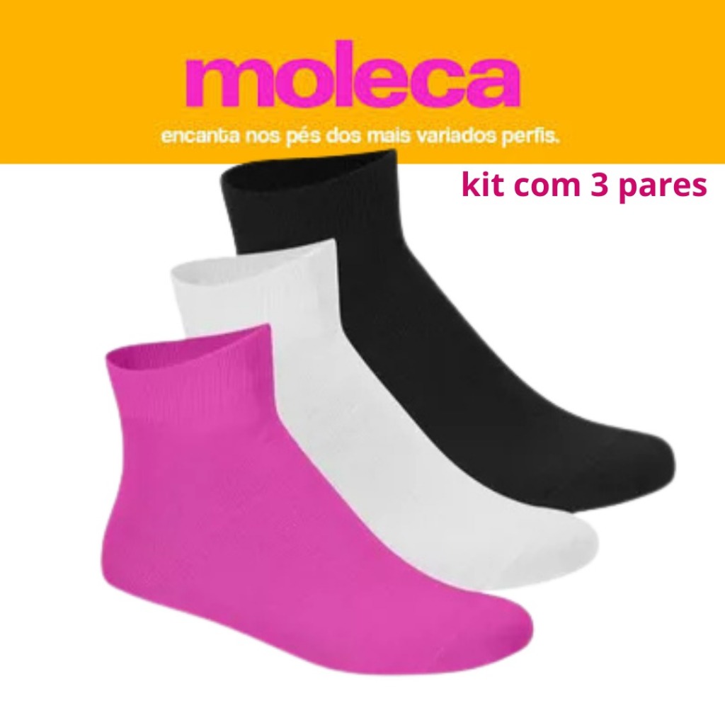 Meia Moleca se uma já maravilhoso imagina um kit. Confeccionada com materiais de alta qualidade, cano macio, é a pedida para todas as horas. Características: Material: 75% Algodão. Cano macio. kit com três pares. O kit contém: 1 par na cor preta 1 par na cor branca 1 par na cor pink Composição da meia: 75% algodão / 22% poliéster / 2% elastano / 1% elastodieno