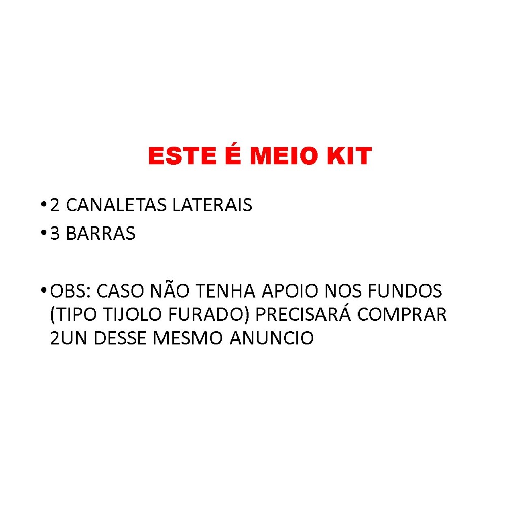 ATENÇÃO COM A QUANTIDADE A SER ESCOLHIDA SUPORTES EM INOX DE EXCELENTE QUALIDADE E ACABAMENTO MELHOR PRODUTO DO MERCADO NACIONAL - ESTE É MEIO KIT - SÓ FRENTE CHURRASQUEIRA SE PRECISAR PARA OS FUNDOS COMPRE 2 UNIDADES - SELECIONE A MEDIDA QUE SE ADEQUE A SUA CHURRASQUEIRA KITs podendo ser de opções: Opção 1 : 2 Suportes laterais E 3 tubos de aluminio 50cm ( MEIO KIT só FRENTE ) Opção 2 : 2 Suportes laterais E 3 tubos de aluminio 60cm ( MEIO KIT só FRENTE ) Opção 3 : 2 Suportes laterais E 3 tubos de aluminio 75cm ( MEIO KIT só FRENTE ) Opção 4 : 2 Suportes laterais E 3 tubos de aluminio 90cm ( MEIO KIT só FRENTE ) As canaletas de suportes das barras são em inox (430) de 39cm altura; Tubos alumínio - 3/8'' 103mm diametro aprox - escolha conforme a largura de sua churrasqueira (50cm, 60cm, 75cm ou 90cm) buchas e parafusos. 1. Suporte com 3 dobras: PROPORCIONA MAIOR RESISTÊNCIA E ESPESSURA DA CHAPA 0,70MM; 2. “5” Regulagens de altura "DIFERENCIAL DE MERCADO"; 3. EM INOX alto de brilho maior resistência à corrosão; Fácil limpeza e higiênica; 4. Fácil Instalação. OBSERVAÇÃO VERIFICAR ANTES DA COMPRA O TAMANHO DE SUA CHURRASQUEIRA - NÃO TEMOS COMO TROCAR AS BARRAS Atende: churrasqueira de 40 até 90cm largura e Altura acima de 40cm, precisa ter paredes laterais para fixar os suportes. Se a churrasqueira for menor que a barra escolhida, poderá serrar com serrinha manual para ajustar a sua churrasqueira. REQUER INSTALAÇÃO: Produto de fácil instalação, você mesmo instala com uma furadeira e broca de 6mm e auxílio de uma trena. Retirar primeiramente a película branca ou azul dos dois lados dos suportes. Para ajustar as barras utilizar uma serra manual - a barra de alumínio é fácil de cortar.