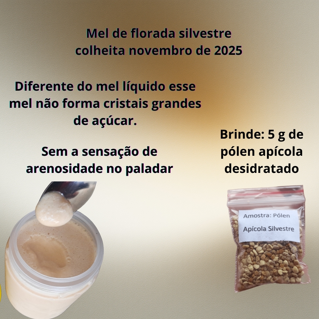 Mel cremoso. Mel puro, sem aditivos, cru, sem fervura ou cozimento. Por ser cru e recém colhido, tem sabor floral presente. É considerado de florada silvestre, por não ter predominância, mas é um mel que pegou as floradas de vassourão, vassourão branco e cafezeiro do mato. colheita de novembro de 2025. O processo de produção consiste em misturar o mel cremoso(semente) no mel líquido, seguido de armazenamento ao frio. A mistura é feita em batedeira para ficar bem homogêneo e cristalizar por completo.( por isso forma bolhas de ar por cima do mel). Não vai haver a sensação de arenosidade ao paladar, é diferente do mel que cristalizou ao natural onde formam-se cristais grandes de glicose. Em temperaturas elevadas pode ocorrer a descristalização e perder a consistência mais firme, para resolver isso basta armazenar na geladeira para recristalizar. Pode ser armazenado na geladeira ou fora, depende da sua preferência a respeito da consistência do mel. Diferenças e semelhanças com o mel líquido Semelhança: é o mesmo sabor do mel líquido normal, é o mesmo mel utilizado; Diferenças: já está na forma cristalizada, então não tem o incoveniente de fazer banho-maria para descristalizar o mel; Outra diferença está na melhor facilidade em passar em pão e torradas, e também para acompanhar queijos Tenho outros produtos anunciados como mel líquido, pólen apícola e extrato de própolis Tenho anúncio de kits de produtos com desconto, caso desejar fazer compra de uma outra combinação de produtos entrar em contato via chat e eu faço novo kit.