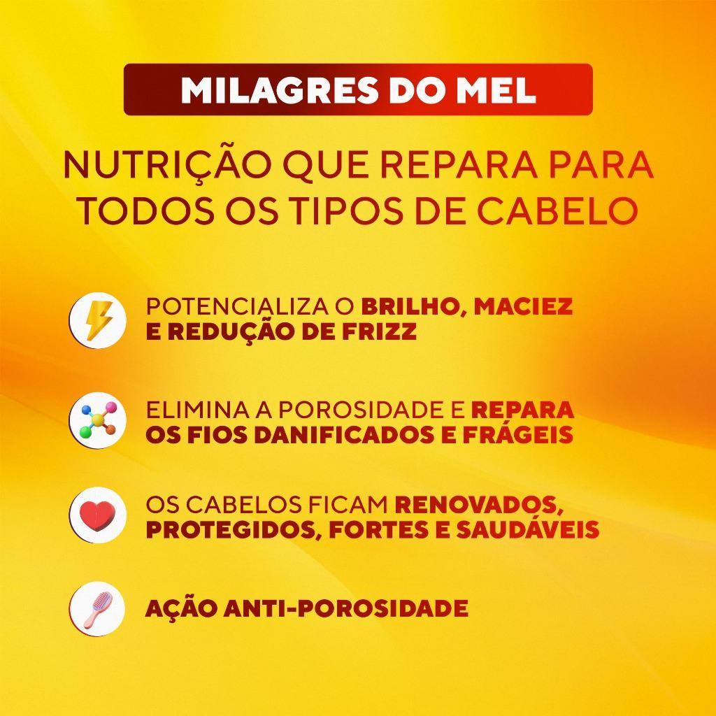 O Mel em Creme da linha Milagres do Mel é o aliado perfeito para nutrir profundamente os fios, garantindo hidratação intensa, maciez incomparável e brilho radiante. O que ele é: Um tratamento versátil enriquecido com Mel de Agave e Colágeno Vegetal, desenvolvido para reparar, nutrir e hidratar os cabelos, deixando-os mais saudáveis e revitalizados. Ações: •Nutre profundamente os fios, devolvendo vitalidade. • Repara danos causados por processos químicos e agressões externas. •Proporciona hidratação intensa e proteção contra o ressecamento. Resultado no Cabelo: Cabelos hidratados, macios, com brilho luminoso e reparados desde a raiz até as pontas. Modo de Uso: • Tratamento Noturno: Aplique do comprimento às pontas dos cabelos antes de dormir. O enxágue ao acordar é opcional. • Pré-shampoo: Nos cabelos úmidos, aplique do comprimento às pontas. Deixe agir por 5 minutos. Enxágue e prossiga com sua rotina de higienização e tratamento. • Umectação: Enluve comprimento e pontas nos cabelos ainda secos. Deixe agir por 30 minutos. Para um tratamento intensivo, deixe agir a noite toda. No dia seguinte, enxágue e prossiga com higienização e tratamento. • Leave-in: Nos cabelos úmidos, distribuir uniformemente para facilitar o desembaraço e a finalização. • Proteção Térmica: Possui proteção térmica e facilita a escovação. Aplique antes de fazer escova e ao usar ferramentas de calor como secador, difusor e chapinha. • Filtro UV: Aplique antes de expor os cabelos ao sol, praia, piscina e reaplique quando mergulhar ou sempre que achar necessário.