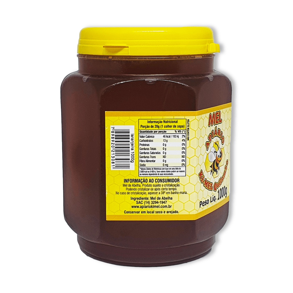 Mel Puro de Abelha de Laranjeira em pote de 1000g, ótimo preço. O Mel predominantemente de Laranjeira possui uma coloração clara, com um aroma suave e com o sabor com um leve toque cítrico. Ele pode ser um bom aliado de quem tem dificuldades para dormir por ajudar a combater a insônia, além de também melhorar o funcionamento do intestino. Benefícios do mel: O mel é um seu aliado para dor de garganta. O mel puro de abelha possui ação antimicrobiana, capaz de impedir o crescimento ou destruir micro-organismos, ele é interessante para aliviar a dor de garganta. Uma dica é um bom chá morno de ervas adoçado com mel. Qual é a quantidade de mel recomendada por dia? Pode variar entre uma colher de chá, cerca de 10 gramas, a uma colher de sopa, aproximadamente 25 gramas. Vale lembrar que este alimento deve ser inserido em uma dieta saudável. Como o mel pode ser consumido? O mel pode ser um substituto saudável do açúcar refinado na preparação de bolos, biscoitos, o famoso pão de mel, entre outros doces. Também costuma ser consumido com torradas, frutas, vitaminas com leite, iogurtes, sucos e até mesmo na receita de carnes. INGREDIENTES: Mel de abelhas INFORMAÇÃO AO CONSUMIDOR - Produto sujeito a cristalização. Podendo cristalizar-se após certo tempo. No caso de cristalização, aquecer a 38º C em banho-maria. - Produto natural sujeito a alterações de cor, aroma, textura e sabor. - Conservar em local seco e arejado. - Este produto não deve ser consumido por crianças menores de um ano de idade. - Não contém glúten Conheça o Apiário Ki-Mel Desde 1991 o Apiário Ki–Mel Quilombo vem se destacando por seu pioneirismo na fabricação de Mel, Própolis, Geleia Real, Pólen e Cera, na região de Iacanga, interior do estado de São Paulo. Conquistou o seu espaço pela qualidade de seus produtos, todos eles certificados pela Secretaria de Agricultura e Abastecimento do Estado de São Paulo (SISP) atendendo as normas vigentes. A empresa possui uma variada linha de produtos Apícolas, voltados à saúde e bem-estar dos seus consumidores, utilizando em suas formulações sempre produtos naturais de altíssima qualidade. Todos os nossos produtos comercializados são totalmente produzidos por nós, dando aos nossos consumidores a confiabilidade e a certeza da qualidade de nossos produtos. Diferente de seus concorrentes, a Ki-Mel não necessita de serviços terceirizados, visto que seus funcionários possuem formações diversas e são competentes para com todas as funções da empresa.