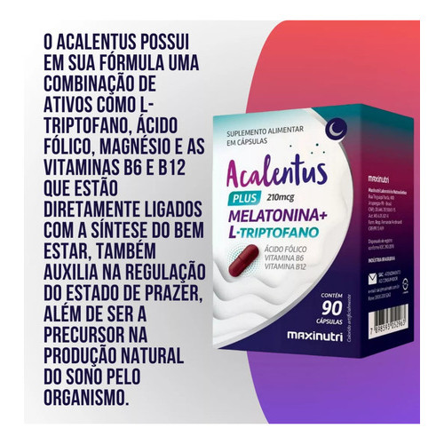 Melatonina Com L Triptofano Vitaminas B6 B9 B12 90cps ENVIO IMEDIATO!!! Acalentus, L-triptofano 250mg, Ácido fólico, Magnésio, Vitamina B6, Vitamina B12. L-triptofano é um aminoácido que o organismo não produz, desta forma existe a necessidade de suplementação. O Acalentus possui em sua fórmula uma combinação de ativos como L-triptofano, ácido fólico, magnésio e as vitaminas B6 e B12 que estão diretamente ligados com a síntese do bem estar, também auxilia na regulação do estado de prazer, além de ser a precursor na produção natural do pelo organismo. Ajuda o corpo a entrar em um estado de relaxamento além de induzir o de maneira natural, diminuindo a insônia, estresse e a ansiedade, melhorando o humor e a memória. SUGESTÃO DE CONSUMO: Ingerir preferencialmente antes de deitar. CONSERVAÇÃO: Conservar ao abrigo da luz, calor e umidade. Após aberto consumir em até 90 dias. RENDIMENTO: 90 porções. INGREDIENTES: Melatonina, L-triptofano, cloridrato de piridoxina, ácido fólico, cianocobalamina, lubrificante: metasilicato ácido de magnésio, excipiente: amido de milho, antiumectantes: estearato de magnésio e dióxido de silício, cápsula: gelatina, corantes: azorrubina, dióxido de titânio, vermelho 40, amarelo crepúsculo e azul brilhante. NÃO CONTÉM GLUTÉM ! ADVERTENCIA: "Este produto não deve ser consumido por gestantes, lactantes, crianças e pessoas envolvidas em atividades que requerem atenção constante. Pessoa com enfermidades e/ou sob o uso de medicamentos, consulte seu médico." Produto indicado para o Grupo Populacional ACIMA DE 19 anos. Este produto não é um medicamento. Não exceder a recomendação diária de consumo indicada na embalagem. Mantenha fora do alcance de crianças.