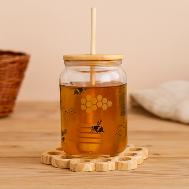 Meleira Decorada de Vidro 400ml com Colher Madeira Tampa e Base Pinus Mesa Café Cozinha Elegante