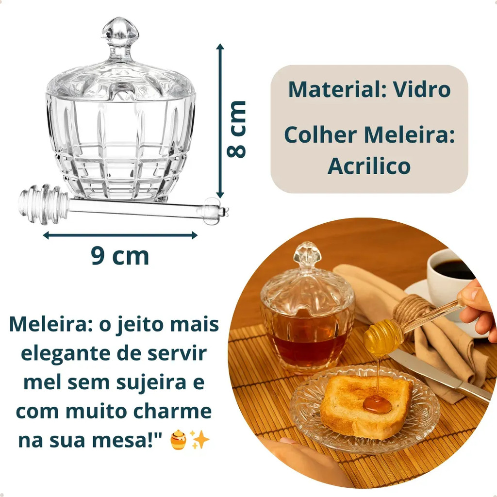 Bem vindo(a) a storm shop, é um prazer te ter como nosso(a) cliente. Pedidos efetuado até ás 11h são enviados no mesmo dia(de segunda a sexta) caso tenha dúvidas nosso chat está aberto e a disposição para lhe atender Meleira lisboa 8,5x10,8cm – Elegância e praticidade na hora de servir o mel! Transforme seu café da manhã ou lanche da tarde com um toque de charme! A Meleira madrid é perfeita para armazenar e servir mel com elegância e sem bagunça. Seu design clássico e sofisticado combina com qualquer mesa, enquanto o formato funcional facilita o uso no dia a dia. Destaques do produto: Dimensões: 8,5 cm x 10,8 cm – ideal para armazenar mel ou caldas. Design elegante Tampa com encaixe perfeito para manter o mel protegido. Material resistente e fácil de limpar. Ideal para uso doméstico, cafés e presentes criativos! Adicione um toque de sofisticação à sua rotina e aproveite o sabor do mel como ele merece!