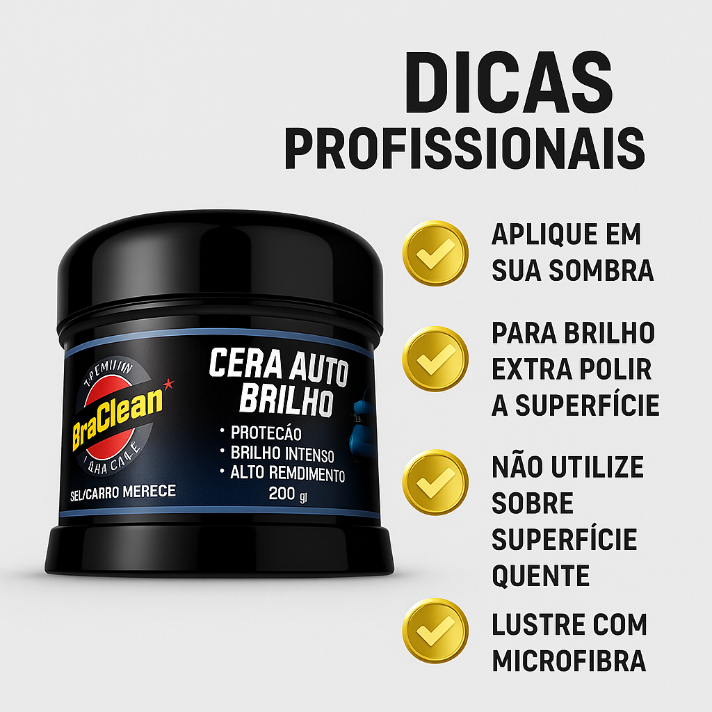 A Cera Auto Brilho 200g BraClean foi desenvolvida para quem quer realçar o brilho da pintura e deixar o carro com aspecto de recém-polido, de forma prática e acessível. Ideal para manutenção periódica, ela ajuda a recuperar o aspecto de verniz, dar toque mais liso à superfície e facilitar a limpeza nas próximas lavagens. Com textura cremosa e fácil de aplicar, é indicada tanto para usuários domésticos quanto para profissionais de estética automotiva que buscam um acabamento limpo, brilhante e com boa apresentação visual da lataria. BENEFÍCIOS • Realçar o brilho da pintura, deixando o carro com aparência mais nova e bem cuidada. • Ajudar a formar uma película protetora temporária contra sujeira leve, poluição e ação do tempo. • Proporcionar toque mais liso à superfície, facilitando a remoção de poeira em limpezas futuras. • Auxiliar na conservação da pintura quando utilizada de forma periódica, como parte da rotina de cuidado. • Textura que facilita a aplicação e o lustro, reduzindo o esforço na hora de encerar. • Produto em pasta/cremosa com 200g, ideal para várias aplicações em um veículo de passeio, dependendo da forma de uso. INFORMAÇÕES TÉCNICAS • Marca: BraClean • Produto: Cera Auto Brilho • Peso: 200g • Categoria: Cera automotiva para acabamento e brilho • Tipo: Cera automotiva em pasta/cremosa para uso manual • Indicação de uso: pinturas automotivas em bom estado ou levemente opacas, em veículos de passeio, utilitários e similares • Acabamento: brilho e toque mais liso, com sensação de pintura renovada • Aplicação: uso externo, sobre superfícies limpas, frias e secas • Conteúdo da embalagem: 1 unidade de Cera Auto Brilho BraClean 200g (Para informações detalhadas de composição, recomendações de segurança e superfícies específicas, consulte o rótulo do produto.) COMO USAR Lave o veículo com shampoo automotivo e enxágue bem, removendo toda a sujeira da superfície. Seque completamente a lataria com pano de microfibra ou toalha apropriada. A aplicação deve ser feita sobre a pintura limpa e seca. Com o carro à sombra e a lataria fria, aplique uma pequena quantidade da Cera Auto Brilho em uma espuma ou pano de microfibra limpo. Espalhe a cera em movimentos circulares ou em linhas retas, trabalhando por partes (capô, teto, portas etc.), formando uma película fina e uniforme. Aguarde alguns instantes para o produto agir e iniciar a formação de leve névoa/seca ao toque, conforme orientação do rótulo. Faça o lustro com pano de microfibra seco e limpo, removendo o excesso e revelando o brilho. Repita o processo nas demais partes do veículo e, se desejar, faça uma segunda aplicação em áreas mais expostas. Após o uso, mantenha a embalagem bem fechada e o produto em local fresco e protegido do sol. PERGUNTAS FREQUENTES (FAQ) Posso aplicar a cera em qualquer cor de carro? Sim. A Cera Auto Brilho BraClean é indicada para veículos de todas as cores (claras, escuras, sólidas ou metálicas), desde que a pintura esteja em bom estado e o produto seja usado conforme o rótulo. A cera remove riscos da pintura? Ela pode ajudar a disfarçar riscos muito superficiais e leves, graças ao brilho e à camada formada, mas não elimina riscos profundos ou danos no verniz. Para correção, é necessário polimento adequado. Preciso polir com máquina para ter resultado? Não. A cera foi desenvolvida para aplicação manual, usando espuma ou pano de microfibra. O polimento com máquina é opcional e deve ser feito apenas por quem tem experiência. Com que frequência devo aplicar a cera? A frequência depende do uso do veículo e das condições de exposição ao sol e à chuva. Em muitos casos, aplicações periódicas a cada algumas semanas ou meses ajudam a manter o brilho, sempre seguindo a orientação do rótulo. Posso aplicar em superfícies quentes ou ao sol? O ideal é não aplicar ao sol direto nem com a lataria quente, pois isso pode dificultar o espalhamento e a remoção do produto, além de comprometer o acabamento. PROVA DE CONFIANÇA – POR QUE COMPRAR A CERA AUTO BRILHO 200g BRACLEAN • Produto desenvolvido especificamente para o cuidado estético automotivo, focado em brilho e acabamento. • Apresentação em 200g com bom rendimento, ideal para quem quer cuidar do próprio carro ou complementar serviços profissionais. • Fórmula pensada para aplicação manual, permitindo que mesmo usuários leigos consigam bons resultados de brilho e apresentação. • Auxilia na rotina de manutenção visual do veículo, complementando lavagem e outros cuidados com a pintura.