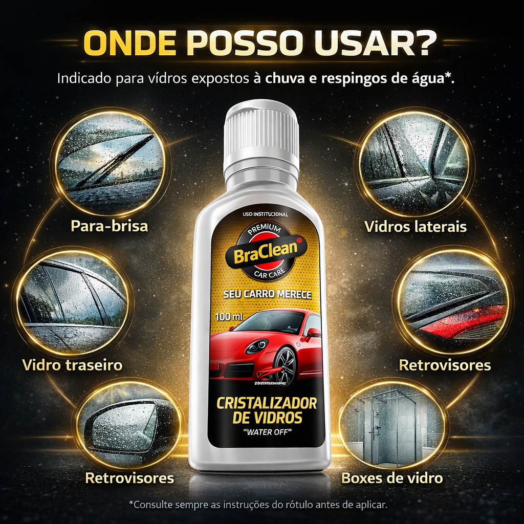 O Cristalizador De Vidros 100ml WaterOff BraClean foi desenvolvido para criar uma película repelente de água sobre o para-brisa e vidros do veículo, ajudando a melhorar a visibilidade em dias de chuva. Ao ser aplicado corretamente, a água tende a formar gotas e escorrer com mais facilidade, reduzindo o acúmulo sobre o vidro e facilitando o trabalho das palhetas do limpador. Além do uso em dias chuvosos, o produto também auxilia na limpeza do vidro, pois a camada formada dificulta a fixação de sujeira leve, contribuindo para um para-brisa mais limpo por mais tempo dentro da rotina de manutenção. BENEFÍCIOS • Ajuda a repelir a água da chuva, formando gotas que escorrem com mais facilidade. • Contribui para melhor visibilidade em dias chuvosos, principalmente em velocidades mais altas. • Facilita o trabalho das palhetas do limpador de para-brisa, ajudando a reduzir arrastos e borrões quando o sistema está em bom estado. • Auxilia na redução da aderência de sujeira leve, tornando a limpeza futura do vidro mais fácil. • Pode ajudar a diminuir o embaçamento externo causado por respingos e névoa fina. • Frasco compacto de 100ml, prático para guardar no veículo ou usar em serviços de estética automotiva. INFORMAÇÕES TÉCNICAS • Marca: BraClean • Produto: Cristalizador De Vidros WaterOff • Volume: 100 ml • Categoria: cristalizador / repelente de água para vidros automotivos • Indicação de uso: para-brisa, vidros laterais, vidro traseiro e, se desejado, espelhos externos (sempre conforme rótulo) • Tipo de produto: líquido para aplicação manual em superfícies de vidro limpas e secas • Uso: automotivo, em superfícies externas de vidro • Conteúdo da embalagem: 1 frasco de Cristalizador De Vidros WaterOff BraClean 100ml (Para composição detalhada, recomendações de segurança e superfícies específicas aprovadas, consulte sempre o rótulo do produto.) COMO USAR Lave bem o vidro com shampoo automotivo e enxágue, removendo toda a sujeira e resíduos. Seque o vidro completamente com pano limpo e sem fiapos. A superfície deve estar fria e à sombra. Certifique-se de que não haja restos de ceras, gorduras ou outros produtos sobre o vidro. Se necessário, faça uma limpeza mais profunda antes. Agite o frasco do Cristalizador De Vidros WaterOff antes de usar. Aplique uma pequena quantidade do produto em um pano de microfibra limpo ou aplicador adequado e espalhe no vidro em movimentos cruzados, formando uma camada fina e uniforme. Deixe o produto agir pelo tempo indicado no rótulo, até começar a formar uma película levemente opaca. Em seguida, faça o polimento com outro pano limpo e seco, removendo o excesso e revelando a transparência. Repita o processo em todos os vidros desejados. Reaplique periodicamente, de acordo com a frequência de uso do veículo, das lavagens e da orientação do fabricante. PERGUNTAS FREQUENTES (FAQ) Posso aplicar o cristalizador na parte interna do vidro? O uso principal é na parte externa dos vidros. Em geral, não é indicado aplicar na parte interna, onde a necessidade é mais de limpeza e controle de embaçamento com produtos específicos. Posso usar em vidros com película (insulfilm)? Antes de usar sobre vidros com película, verifique as orientações do rótulo. Se for permitido, aplique com cuidado e em pequena área de teste. Caso não haja indicação clara, limite o uso aos vidros externos sem película. Quanto tempo dura o efeito do cristalizador? A durabilidade depende da frequência de uso do veículo, intensidade de chuva, atrito das palhetas e produtos usados na lavagem. Em geral, o efeito tende a diminuir com o tempo, sendo recomendada reaplicação periódica. O produto substitui o limpador de para-brisa? Não. O cristalizador é um complemento. Ele ajuda na repelência da água e na melhoria da visibilidade, mas não substitui o sistema de limpadores em bom estado, nem a necessidade de manutenção adequada. Posso aplicar em vidros de casa ou box de banheiro? Em muitos casos, o produto pode ser utilizado em outras superfícies de vidro, desde que o objetivo seja repelência de água e não haja restrição no rótulo. Ainda assim, sempre faça um teste em pequena área antes de aplicar em toda a superfície. PROVA DE CONFIANÇA – POR QUE COMPRAR O CRISTALIZADOR DE VIDROS 100ml WATEROFF BRACLEAN • Produto desenvolvido especificamente para aplicação em vidros automotivos, pensando na melhoria de visibilidade em chuva. • Embalagem de 100 ml prática para uso em um ou mais veículos, com aplicação manual simples. • Pode ser integrado à rotina de estética automotiva, somando-se à lavagem e à limpeza de vidros para um resultado mais completo. • Aliado importante para quem dirige com frequência em chuva e busca mais conforto visual e sensação de segurança ao volante.