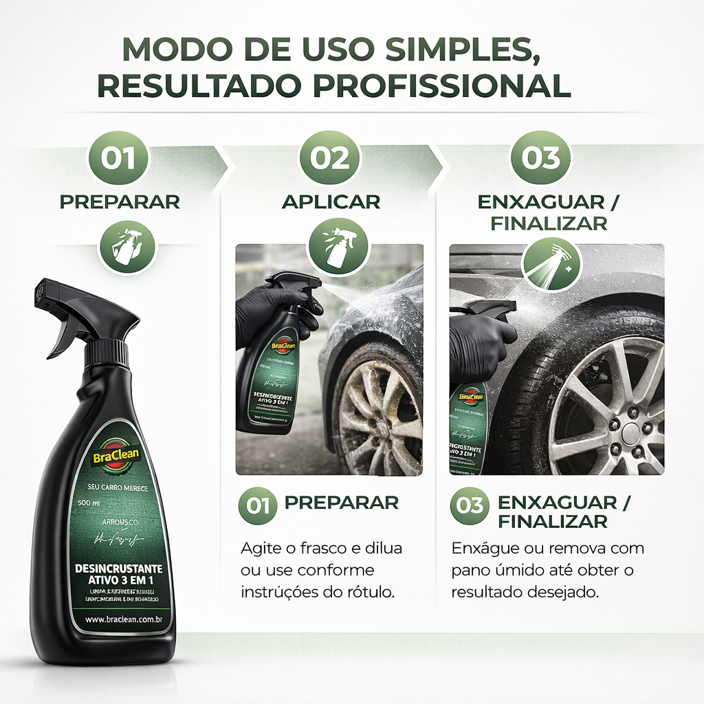 O Desincrustante Ativo 3 em 1 500ml BraClean foi desenvolvido para quem precisa de praticidade na hora de encarar sujeira pesada em áreas específicas do veículo. Ele auxilia na remoção de resíduos difíceis, gordura, fuligem e incrustações em superfícies resistentes, reunindo em um único produto ação desincrustante, desengraxante e de limpeza profunda. Ideal para uso em rodas, caixas de rodas, partes baixas, motores (externamente) e outras áreas críticas, é um grande aliado de lava-rápidos, estéticas automotivas e também de quem gosta de cuidar pessoalmente do carro com resultado de nível profissional. BENEFÍCIOS • Ajudar a remover incrustações, barro, fuligem, resíduos de freio e sujeiras pesadas em superfícies compatíveis. • Atuar como desengraxante, auxiliando na remoção de óleo e gordura aderida em pontos específicos. • Proporcionar limpeza profunda em áreas de difícil acesso e sujeira acumulada. • Reunir três funções em um único produto: desincrusta, desengraxa e limpa, facilitando a rotina de trabalho. • Frasco prático de 500ml, ideal para uso direcionado em detalhes, motores, rodas e partes baixas. • Indicado tanto para uso profissional quanto para uso doméstico em veículos de passeio e utilitários. INFORMAÇÕES TÉCNICAS • Marca: BraClean • Produto: Desincrustante Ativo 3 em 1 • Volume: 500 ml • Categoria: desincrustante / desengraxante para limpeza pesada em áreas específicas • Tipo: produto líquido, de uso concentrado ou semiconcentrado (ver diluição sugerida na embalagem) • Indicação de uso: rodas, caixas de rodas, partes baixas, motores (limpeza externa) e outras superfícies resistentes compatíveis • Não indicado para: superfícies sensíveis, pinturas delicadas, cromados finos, plásticos delicados ou materiais que possam ser atacados por desincrustantes (sempre testar em pequena área) • Aplicação: uso externo, por pulverização direta ou com auxílio de pano/escova • Conteúdo da embalagem: 1 frasco de Desincrustante Ativo 3 em 1 BraClean 500ml (Para informações detalhadas de diluição, composição, pH, EPIs recomendados e restrições de uso, consulte diretamente o rótulo do produto.) COMO USAR Leia atentamente as instruções do rótulo antes da aplicação e utilize os equipamentos de proteção individual recomendados (luvas, óculos e, se necessário, máscara). Verifique se a superfície a ser limpa é resistente ao uso de desincrustantes. Faça um teste em pequena área discreta antes de aplicar em toda a região. Se o produto permitir diluição, prepare a solução de acordo com a orientação do fabricante para o nível de sujeira (leve, média ou pesada). Com a superfície fria e à sombra, aplique o Desincrustante Ativo 3 em 1 diretamente sobre a área suja, por pulverização ou com pano/esponja adequada. Deixe o produto agir por alguns instantes, sem deixar secar sobre a superfície. Em sujeiras muito aderidas, esfregue com escova ou esponja apropriada para potencializar a ação mecânica. Enxágue em seguida com água em abundância, de preferência com jato forte, removendo totalmente o produto e os resíduos desprendidos. Se necessário, repita o processo em pontos com incrustação mais intensa. Após o uso, feche bem o frasco e armazene em local fresco, seco e fora do alcance de crianças e animais. PERGUNTAS FREQUENTES (FAQ) Posso usar o Desincrustante Ativo 3 em 1 na pintura do carro? Não é recomendado aplicar diretamente na pintura automotiva, pois desincrustantes podem ser agressivos para o verniz. Para lataria, utilize shampoos e produtos específicos. Serve para limpar rodas e caixas de roda? Sim. O produto é indicado justamente para áreas de sujeira pesada, como rodas, caixas de rodas e partes baixas, sempre respeitando testes prévios e enxágue rápido e abundante. Preciso diluir o produto ou posso usar puro? Depende do nível de sujeira e da orientação do rótulo. Em muitos casos, para sujeira muito pesada pode ser usado mais concentrado; para manutenção, pode ser diluído. Sempre siga a indicação do fabricante. Pode ser usado em motor? Sim, em geral é utilizado na limpeza externa de motores, desde que o sistema esteja frio, protegido contra entrada de água em partes sensíveis e que o enxágue seja cuidadoso. Em caso de dúvida, é indicado que a aplicação seja feita por profissional. É obrigatório usar EPI? Sim. Por se tratar de produto para limpeza pesada, o uso de luvas, óculos de proteção e ambiente ventilado é fortemente recomendado, evitando contato direto com pele, olhos e inalação de respingos. PROVA DE CONFIANÇA – POR QUE COMPRAR O DESINCRUSTANTE ATIVO 3 EM 1 500ml BRACLEAN • Produto desenvolvido para limpeza pesada em áreas críticas do veículo, reunindo várias funções em um só frasco. • Volume de 500ml ideal para uso direcionado em detalhes, motores e rodas, com bom rendimento em aplicações profissionais e domésticas. • Formulação pensada para oferecer desempenho na remoção de sujeira difícil, quando utilizada de forma correta e segura.