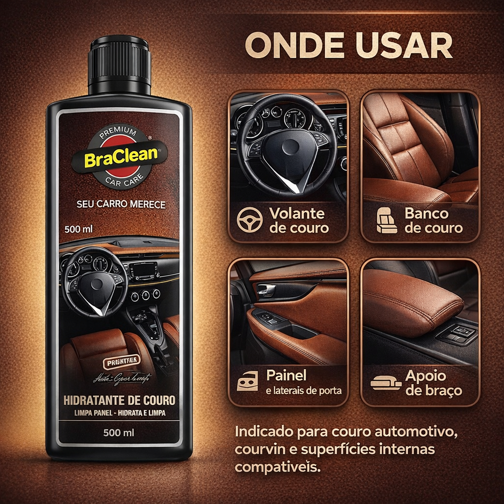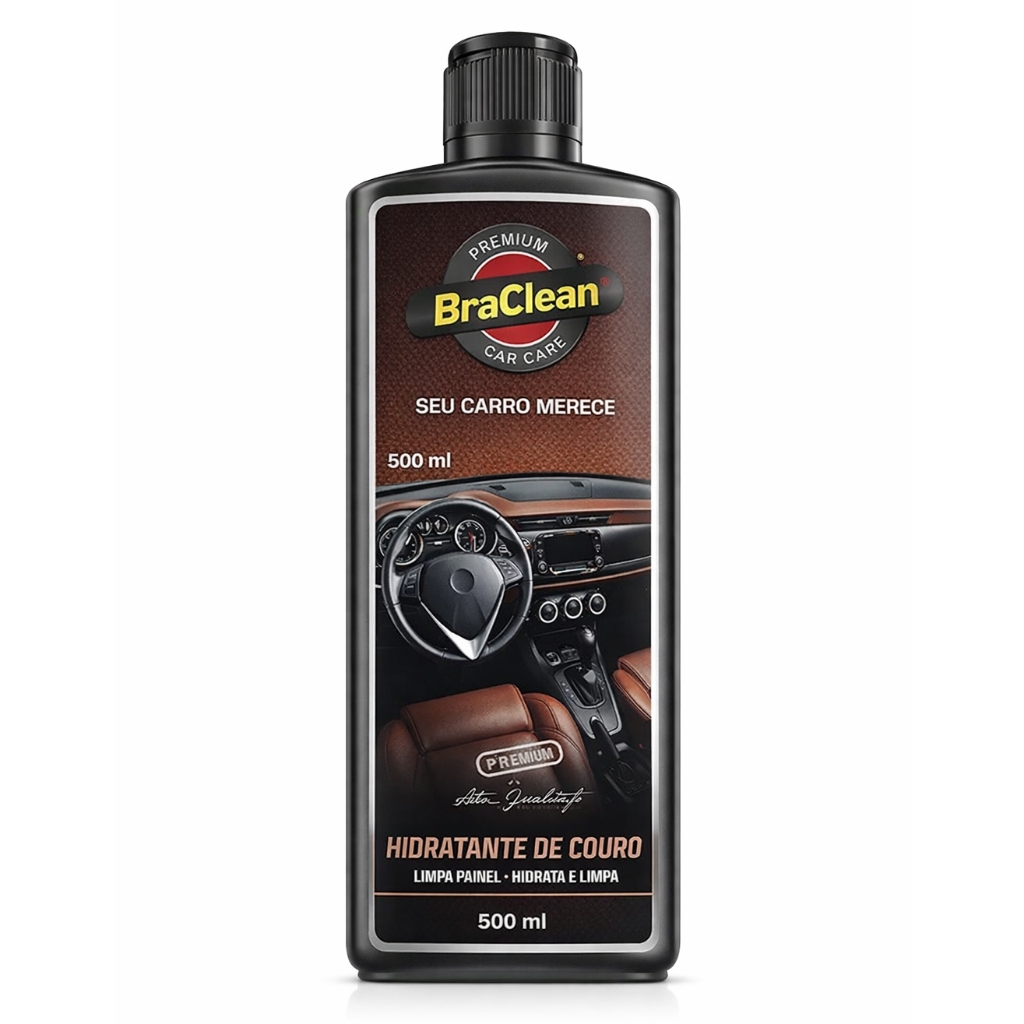 O Limpa Painel Hidratante De Couros 500ml BraClean foi desenvolvido para limpar e, ao mesmo tempo, auxiliar na hidratação de painéis, peças de couro sintético e, quando compatível, couro natural, além de plásticos e vinis internos do veículo. Ajuda a remover sujeira leve e poeira, deixando toque mais agradável e aparência de superfície bem cuidada. BENEFÍCIOS • Limpa painéis, plásticos e algumas superfícies de couro compatíveis. • Ajuda a hidratar e conservar o aspecto do material, quando usado regularmente. • Contribui para reduzir o ressecamento e aspecto opaco de alguns revestimentos. • Deixa sensação de superfície mais macia e visualmente renovada. • Embalagem de 500ml ideal para uso em veículos de passeio e utilitários. INFORMAÇÕES TÉCNICAS • Marca: BraClean • Produto: Limpa Painel Hidratante De Couros • Volume: 500 ml • Categoria: limpador e hidratante para painéis e couros • Indicação: painéis, bancos em couro sintético e materiais compatíveis (testar em couro natural) • Tipo: pronto para uso • Conteúdo da embalagem: 1 frasco de 500ml COMO USAR Aspire ou remova a poeira da superfície a ser tratada. Aplique o produto em pano macio ou aplicador de espuma. Espalhe em movimentos suaves sobre o painel, revestimentos e couros compatíveis. Deixe agir por alguns instantes, se indicado no rótulo. Remova o excesso com pano limpo e seco, deixando acabamento uniforme. Em couro natural, sempre faça teste em área discreta antes de usar em toda a peça. FAQ Posso usar em couro natural de alta qualidade? Faça sempre teste prévio. Em alguns casos, é preferível usar hidratantes específicos recomendados pelo fabricante do veículo. Deixa o painel escorregadio ou brilhando demais? A proposta é deixar aspecto limpo e cuidado, evitando brilho excessivo. Aplique pouca quantidade e remova bem o excesso. Posso usar em casa, em sofás de couro? Pode ser utilizado em alguns revestimentos, desde que testado antes e compatível com o tipo de couro ou material. PROVA DE CONFIANÇA – POR QUE COMPRAR O LIMPA PAINEL HIDRATANTE DE COUROS 500ml BRACLEAN • Combina limpeza e cuidado em um só produto. • Especialmente pensado para o interior do veículo. • Pode ajudar a prolongar o bom aspecto de painéis e revestimentos, quando usado com regularidade.