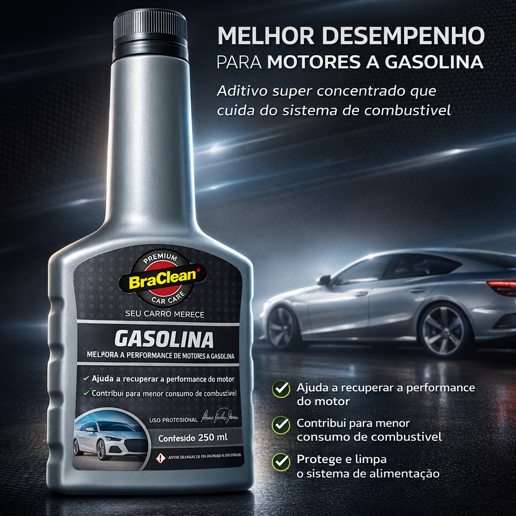 O Aditivo Combustível Gasolina 250ml BraClean foi desenvolvido para auxiliar na limpeza e manutenção do sistema de alimentação de motores a gasolina. Seu uso regular ajuda a remover e prevenir depósitos em bicos injetores, válvulas e câmaras de combustão, contribuindo para uma queima mais uniforme do combustível e para um funcionamento mais estável do motor. Ao atuar diretamente no combustível, o aditivo pode colaborar na redução de falhas, engasgos e perda de rendimento causados por sujeira no sistema, especialmente em veículos utilizados com frequência em trânsito urbano, onde há muitas partidas e paradas. BENEFÍCIOS • Ajudar a limpar bicos injetores e componentes do sistema de alimentação em motores a gasolina. • Contribuir para reduzir a formação de borras, vernizes e resíduos no sistema de combustível. • Auxiliar em uma combustão mais eficiente, favorecendo respostas mais regulares do motor. • Ajudar a minimizar falhas, engasgos e oscilações de marcha lenta causadas por sujeira no sistema. • Colaborar para melhor aproveitamento do combustível, dependendo do estado do motor e das condições de uso. • Frasco prático de 250ml, indicado para tratamento via tanque em um abastecimento, conforme orientação de uso. INFORMAÇÕES TÉCNICAS • Marca: BraClean • Produto: Aditivo Combustível Gasolina • Volume: 250 ml • Categoria: aditivo para combustível gasolina / limpeza de sistema de alimentação • Indicação de uso: veículos com motor a gasolina (carros, SUVs, picapes leves), conforme manual do fabricante • Função principal: auxiliar na limpeza do sistema de combustível e na prevenção de depósitos em bicos injetores e câmaras de combustão • Modo de aplicação: adicionado diretamente no tanque de combustível • Compatibilidade: gasolina comum ou aditivada, conforme orientações do rótulo e do manual do veículo • Conteúdo da embalagem: 1 frasco de Aditivo Combustível Gasolina BraClean 250 ml (Para dosagem exata, composição e advertências de segurança, seguir sempre as instruções do rótulo do produto.) COMO USAR Verifique no rótulo a quantidade recomendada de aditivo para o volume de gasolina do tanque. Com o veículo desligado, abra a tampa do tanque de combustível. Despeje o conteúdo do Aditivo Combustível Gasolina 250ml BraClean diretamente no tanque. Em seguida, abasteça com gasolina na quantidade desejada, permitindo que o fluxo do combustível misture o aditivo. Feche o tanque e utilize o veículo normalmente, deixando o produto agir ao longo do consumo do combustível tratado. Repita a aplicação na frequência indicada pelo fabricante do produto ou conforme recomendação de um profissional de confiança. PERGUNTAS FREQUENTES (FAQ) Posso usar o aditivo em qualquer carro a gasolina? Em geral, o produto é indicado para motores a gasolina de veículos leves, mas a referência principal deve ser o manual do veículo. Em caso de dúvida, consulte um mecânico de confiança. O aditivo resolve todos os problemas de falha do motor? Não. O aditivo auxilia na limpeza do sistema de combustível e pode melhorar o funcionamento, mas não substitui revisões mecânicas, troca de filtros ou reparos em componentes danificados. Em quanto tempo posso perceber resultados? Os efeitos podem ser percebidos ao longo do uso de um ou mais tanques tratados, variando conforme o estado do sistema, a qualidade do combustível e as condições de uso do veículo. Posso usar mais produto do que o recomendado para limpar mais rápido? Não é indicado. Exceder a dosagem recomendada não garante melhor resultado e pode ser contraproducente. Use sempre na proporção sugerida no rótulo. O aditivo pode prejudicar o motor? Quando utilizado na dosagem correta, em veículos compatíveis e com manutenção em dia, o aditivo é formulado para ser seguro. O uso inadequado ou em sistemas já comprometidos pode não trazer os resultados esperados. PROVA DE CONFIANÇA – POR QUE COMPRAR O ADITIVO COMBUSTÍVEL GASOLINA 250ml BRACLEAN • Produto de marca especializada em cuidados e limpeza automotiva. • Formulação voltada para auxiliar na limpeza do sistema de alimentação em motores a gasolina. • Frasco de 250 ml com aplicação simples via tanque, prático para o dia a dia. • Pode ser um aliado na manutenção preventiva, em conjunto com combustível de qualidade e revisões periódicas do veículo.