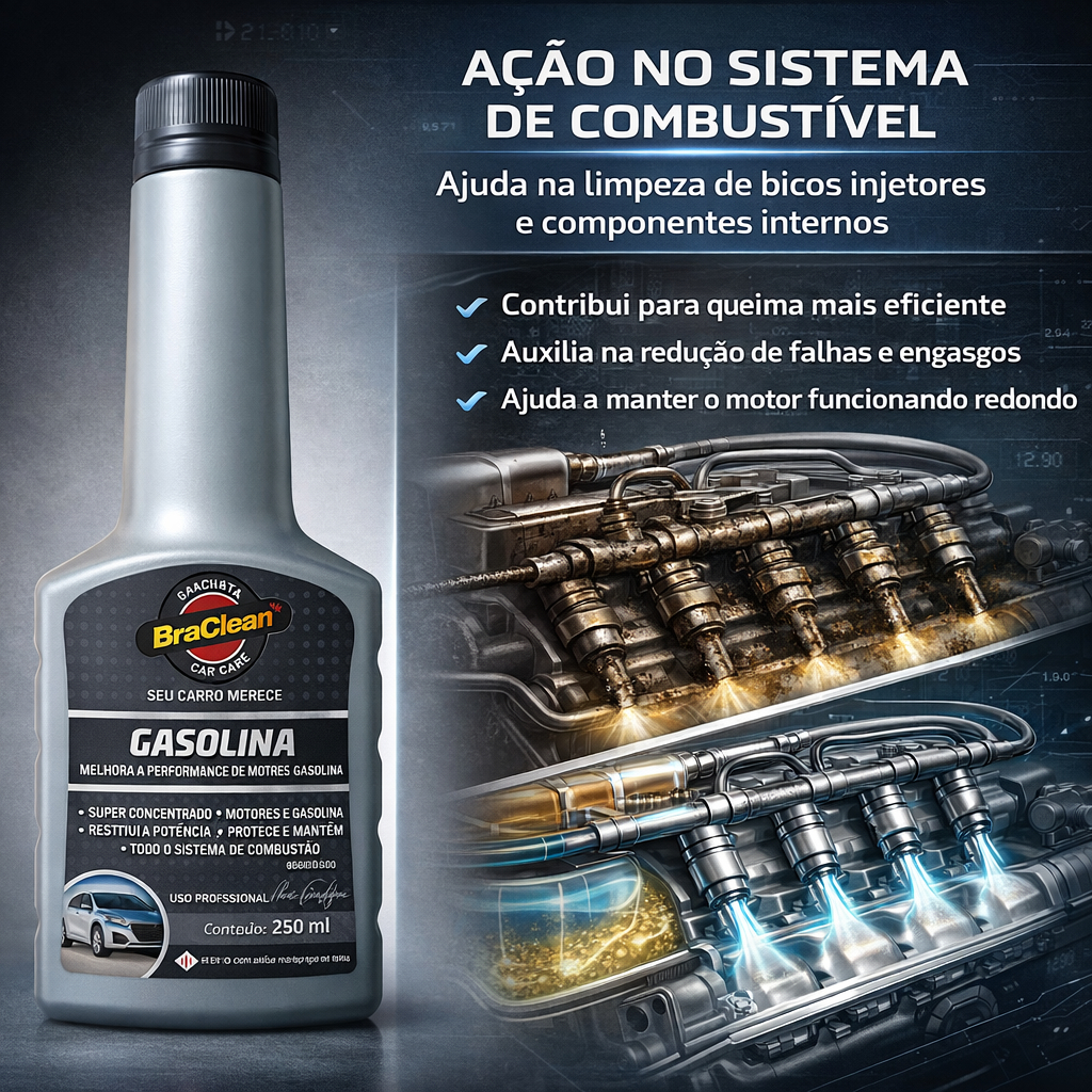 O Aditivo Combustível Gasolina 250ml BraClean foi desenvolvido para auxiliar na limpeza e manutenção do sistema de alimentação de motores a gasolina. Seu uso regular ajuda a remover e prevenir depósitos em bicos injetores, válvulas e câmaras de combustão, contribuindo para uma queima mais uniforme do combustível e para um funcionamento mais estável do motor. Ao atuar diretamente no combustível, o aditivo pode colaborar na redução de falhas, engasgos e perda de rendimento causados por sujeira no sistema, especialmente em veículos utilizados com frequência em trânsito urbano, onde há muitas partidas e paradas. BENEFÍCIOS • Ajudar a limpar bicos injetores e componentes do sistema de alimentação em motores a gasolina. • Contribuir para reduzir a formação de borras, vernizes e resíduos no sistema de combustível. • Auxiliar em uma combustão mais eficiente, favorecendo respostas mais regulares do motor. • Ajudar a minimizar falhas, engasgos e oscilações de marcha lenta causadas por sujeira no sistema. • Colaborar para melhor aproveitamento do combustível, dependendo do estado do motor e das condições de uso. • Frasco prático de 250ml, indicado para tratamento via tanque em um abastecimento, conforme orientação de uso. INFORMAÇÕES TÉCNICAS • Marca: BraClean • Produto: Aditivo Combustível Gasolina • Volume: 250 ml • Categoria: aditivo para combustível gasolina / limpeza de sistema de alimentação • Indicação de uso: veículos com motor a gasolina (carros, SUVs, picapes leves), conforme manual do fabricante • Função principal: auxiliar na limpeza do sistema de combustível e na prevenção de depósitos em bicos injetores e câmaras de combustão • Modo de aplicação: adicionado diretamente no tanque de combustível • Compatibilidade: gasolina comum ou aditivada, conforme orientações do rótulo e do manual do veículo • Conteúdo da embalagem: 1 frasco de Aditivo Combustível Gasolina BraClean 250 ml (Para dosagem exata, composição e advertências de segurança, seguir sempre as instruções do rótulo do produto.) COMO USAR Verifique no rótulo a quantidade recomendada de aditivo para o volume de gasolina do tanque. Com o veículo desligado, abra a tampa do tanque de combustível. Despeje o conteúdo do Aditivo Combustível Gasolina 250ml BraClean diretamente no tanque. Em seguida, abasteça com gasolina na quantidade desejada, permitindo que o fluxo do combustível misture o aditivo. Feche o tanque e utilize o veículo normalmente, deixando o produto agir ao longo do consumo do combustível tratado. Repita a aplicação na frequência indicada pelo fabricante do produto ou conforme recomendação de um profissional de confiança. PERGUNTAS FREQUENTES (FAQ) Posso usar o aditivo em qualquer carro a gasolina? Em geral, o produto é indicado para motores a gasolina de veículos leves, mas a referência principal deve ser o manual do veículo. Em caso de dúvida, consulte um mecânico de confiança. O aditivo resolve todos os problemas de falha do motor? Não. O aditivo auxilia na limpeza do sistema de combustível e pode melhorar o funcionamento, mas não substitui revisões mecânicas, troca de filtros ou reparos em componentes danificados. Em quanto tempo posso perceber resultados? Os efeitos podem ser percebidos ao longo do uso de um ou mais tanques tratados, variando conforme o estado do sistema, a qualidade do combustível e as condições de uso do veículo. Posso usar mais produto do que o recomendado para limpar mais rápido? Não é indicado. Exceder a dosagem recomendada não garante melhor resultado e pode ser contraproducente. Use sempre na proporção sugerida no rótulo. O aditivo pode prejudicar o motor? Quando utilizado na dosagem correta, em veículos compatíveis e com manutenção em dia, o aditivo é formulado para ser seguro. O uso inadequado ou em sistemas já comprometidos pode não trazer os resultados esperados. PROVA DE CONFIANÇA – POR QUE COMPRAR O ADITIVO COMBUSTÍVEL GASOLINA 250ml BRACLEAN • Produto de marca especializada em cuidados e limpeza automotiva. • Formulação voltada para auxiliar na limpeza do sistema de alimentação em motores a gasolina. • Frasco de 250 ml com aplicação simples via tanque, prático para o dia a dia. • Pode ser um aliado na manutenção preventiva, em conjunto com combustível de qualidade e revisões periódicas do veículo.