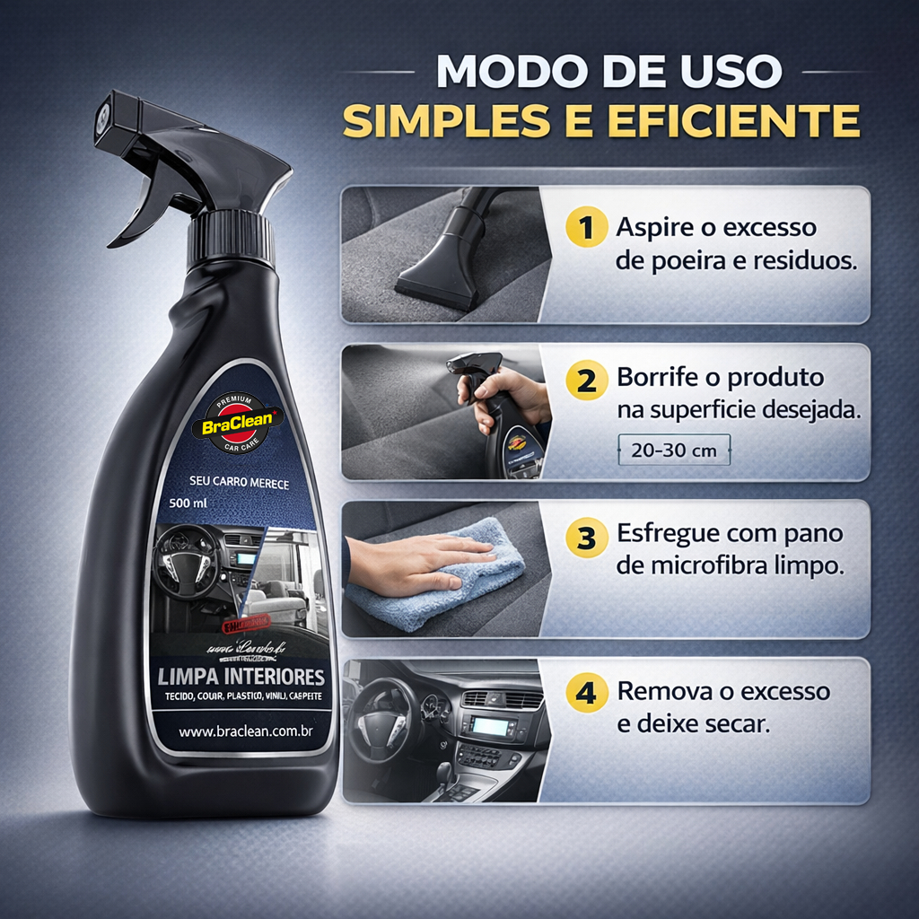 O Limpa Interiores 500ml BraClean foi desenvolvido para limpeza de bancos, painéis, forros de porta, plásticos, vinis, tecidos e outras superfícies internas compatíveis. Ajuda a remover sujeira do dia a dia, marcas de uso e pequenos respingos, deixando o interior com aparência de bem cuidado. Ideal para uso em carros de passeio, utilitários e até ambientes domésticos em superfícies compatíveis, é um aliado na rotina de manutenção interna. BENEFÍCIOS • Auxilia na remoção de sujeira leve em bancos, plásticos e forros. • Pode ser usado em tecidos automotivos, couro sintético e vinil, com teste prévio. • Deixa o interior com aspecto mais limpo e organizado. • Pronto para uso, em frasco de fácil manuseio. • Indicado tanto para uso doméstico quanto profissional em lava-rápidos e estéticas. INFORMAÇÕES TÉCNICAS • Marca: BraClean • Produto: Limpa Interiores • Volume: 500 ml • Categoria: limpador para superfícies internas automotivas • Tipo: limpador pronto para uso em spray ou gatilho (conforme embalagem) • Indicação: painéis, plásticos, forros, tecidos e estofados compatíveis • Uso: automotivo e, quando aplicável, doméstico • Conteúdo da embalagem: 1 frasco de Limpa Interiores BraClean 500ml COMO USAR Aspire ou remova o excesso de poeira da superfície. Aplique o Limpa Interiores em pano, esponja ou diretamente na área a ser limpa, evitando encharcar tecidos. Esfregue suavemente com pano ou escova macia. Remova o excesso com pano limpo e levemente úmido, se necessário. Finalize com pano seco, deixando a superfície uniforme. Em superfícies delicadas, teste em pequena área escondida antes de aplicar em toda a peça. FAQ Posso usar em couro natural? Use com cautela e teste antes. Para couro natural, produtos específicos podem ser mais indicados. Remove manchas profundas? Ajuda em sujeiras recentes e superficiais. Manchas antigas podem exigir limpeza mais profunda ou serviço especializado. Posso usar em casa? Sim, em muitos estofados e superfícies compatíveis, sempre fazendo teste prévio. PROVA DE CONFIANÇA – POR QUE COMPRAR O LIMPA INTERIORES 500ml BRACLEAN • Produto versátil para limpeza interna automotiva. • Fácil de usar, com resultado rápido no dia a dia. • Pode compor o kit de manutenção interna de qualquer veículo.