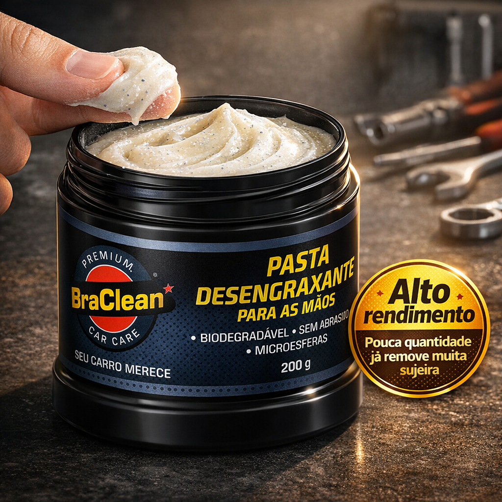 A Pasta Desengraxante Para Mãos 200g BraClean foi desenvolvida para quem trabalha com mecânica, oficinas, indústria, construção ou atividades que sujam muito as mãos com graxa, óleo, fuligem e resíduos difíceis de remover. Sua fórmula limpa com eficiência, ajudando a soltar a sujeira pesada sem a necessidade de solventes agressivos, quando utilizada corretamente. Ideal para uso individual, bancada ou caixa de ferramentas. BENEFÍCIOS • Ajuda a remover graxa, óleo e sujeiras pesadas das mãos. • Fórmula pastosa que facilita a aplicação localizada. • Pode dispensar o uso de solventes agressivos em muitas situações. • Indicado para oficinas, mecânicos, profissionais de manutenção e uso doméstico em trabalhos pesados. • Embalagem de 200g prática para uso pessoal e transporte. INFORMAÇÕES TÉCNICAS • Marca: BraClean • Produto: Pasta Desengraxante Para Mãos • Volume: 200 g • Categoria: limpador de mãos para sujeira pesada • Indicação: remoção de graxa, óleo e fuligem das mãos • Uso: profissional e doméstico • Conteúdo da embalagem: 1 pote de 200g COMO USAR Com as mãos secas, aplique pequena quantidade de pasta. Esfregue as mãos, incluindo unhas e regiões mais sujas, até a sujeira se soltar. Enxágue com água corrente. Se necessário, repita o processo. Evite contato com olhos. Em caso de irritação, enxágue abundantemente e suspenda o uso. FAQ Preciso usar água para funcionar? A pasta começa a agir com as mãos secas e depois é enxaguada com água. Posso usar em outras partes do corpo? É indicada apenas para as mãos. Não usar em rosto, olhos ou pele sensível. Substitui luvas de proteção? Não. O ideal é sempre usar EPIs adequados. POR QUE COMPRAR A PASTA DESENGRAXANTE PARA MÃOS 200g BRACLEAN • Produto pensado para o dia a dia de quem lida com sujeira pesada. • Embalagem compacta, ideal para uso pessoal e mobilidade.